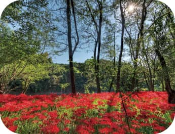 直径約500メートル、面積約22ヘクタールの川に囲まれた平地には、菜の花、コスモスなどの花々が咲き、中でも秋の曼珠沙華(まんじゅしゃげ)群生地は辺り一面が真紅に染まり、まるで赤い絨毯(じゅうたん)を敷き詰めたような景色。毎年多くの人がその美しさに惹かれて訪れます。