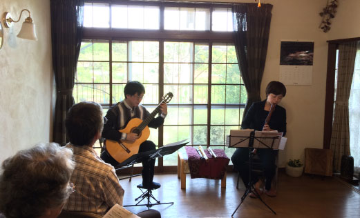 Ke-yaki 「陶芸コンサート」富川勝智さん(ギター)、高橋明日香さん(リコーダー)2015年4月26日の様子。