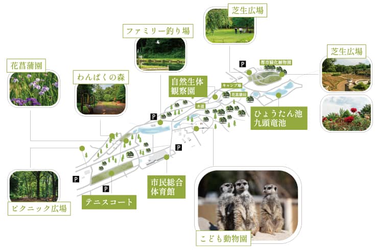 東京ドーム約11個分の広大な面積を誇る総合公園。アスレチック、こども動物園などお子様が楽しめるアミューズメント施設から、植物園や釣り場など大人も楽しめる様々なエリアがあります。