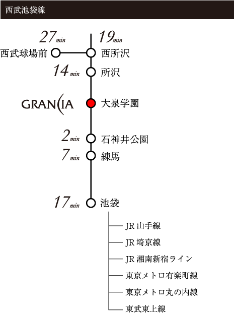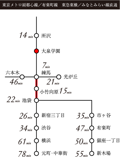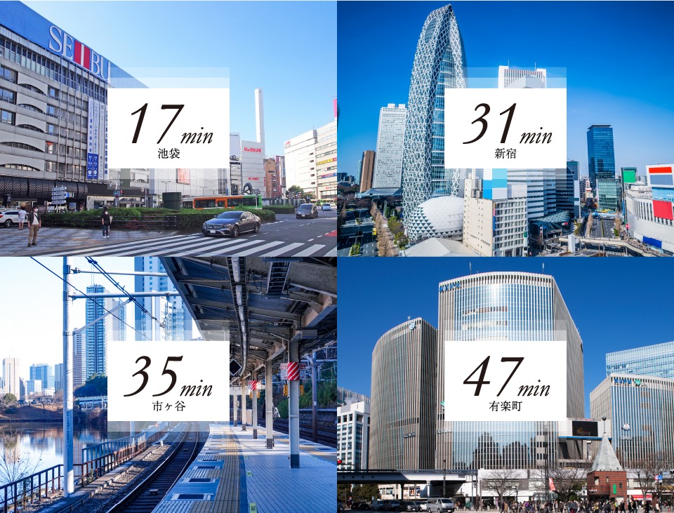 - ※池袋駅へは西武池袋線準急を利用。※新宿駅へは西武池袋線通勤急行を利用、池袋駅にてJR湘南新宿ラインに乗換。※渋谷駅へは西武池袋線準急を利用、練馬駅にて西武有楽町線に乗換。※東京駅へは西武池袋線通勤急行を利用、池袋駅にて東京メトロ丸の内に乗換。※市ヶ谷駅へは西武池袋線準急を利用、練馬駅より西武・東京メトロ有楽町線に乗換。※有楽町駅へは西武池袋線通勤急行を利用、池袋駅より東京メトロ有楽町線に乗換。※銀座一丁目駅へは西武池袋線準急を利用、池袋駅より東京メトロ有楽町線に乗換。※元町・中華街駅へは西武池袋線準急を利用、練馬駅より東京メトロ副都心線に乗換。