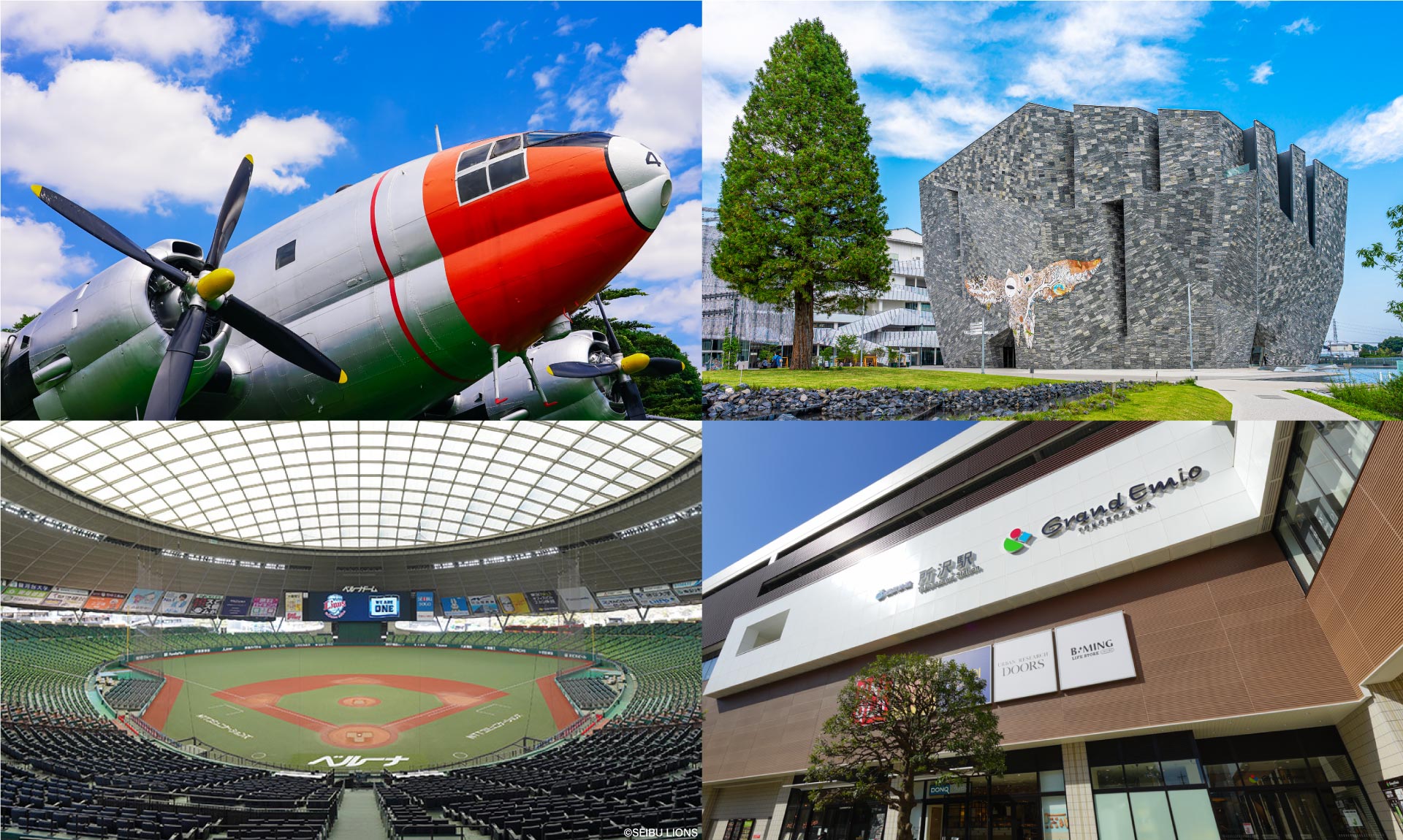 左上から所沢航空記念公園、ところざわサクラタウン、ベルーナドーム、グランエミオ所沢