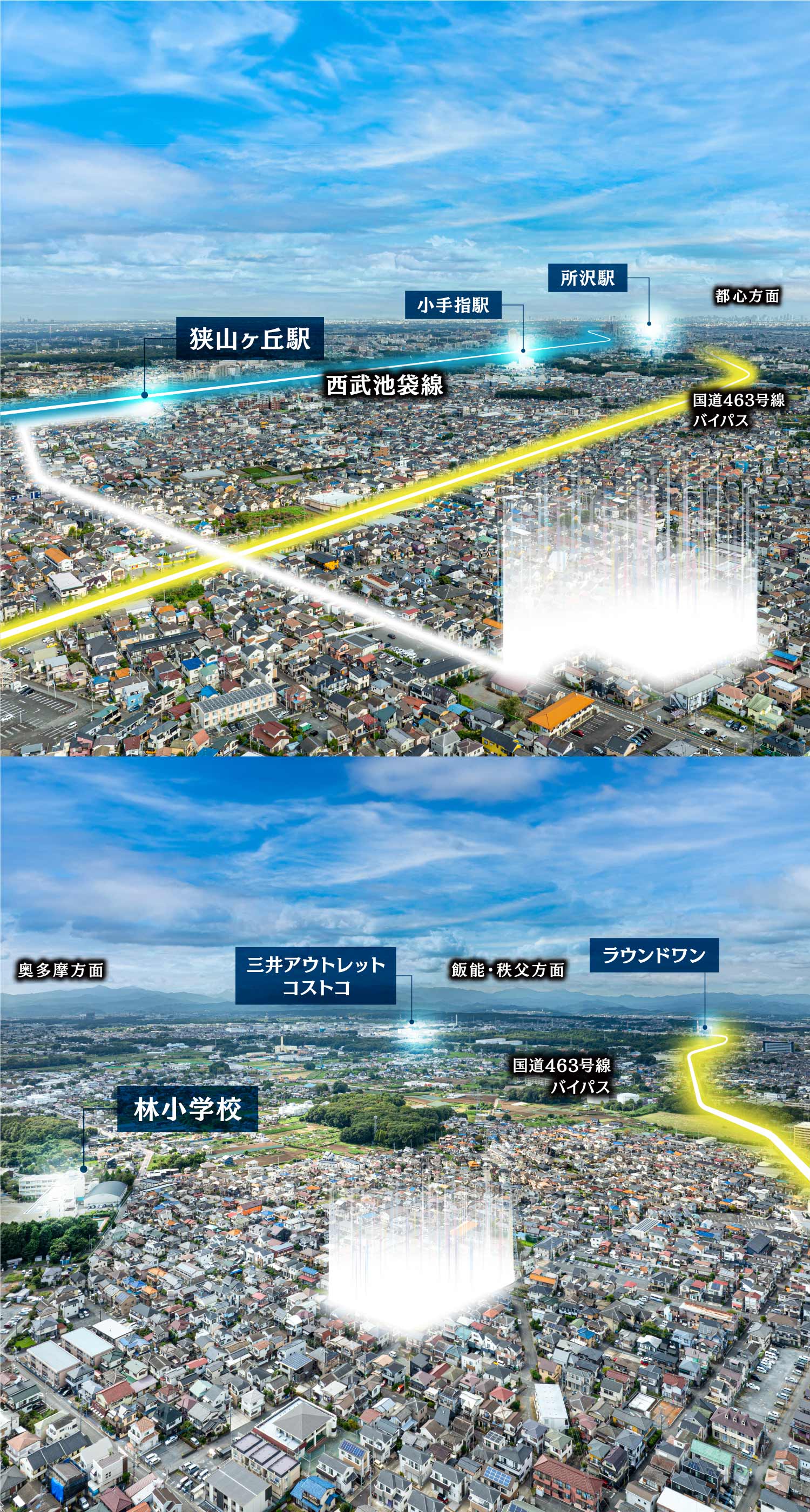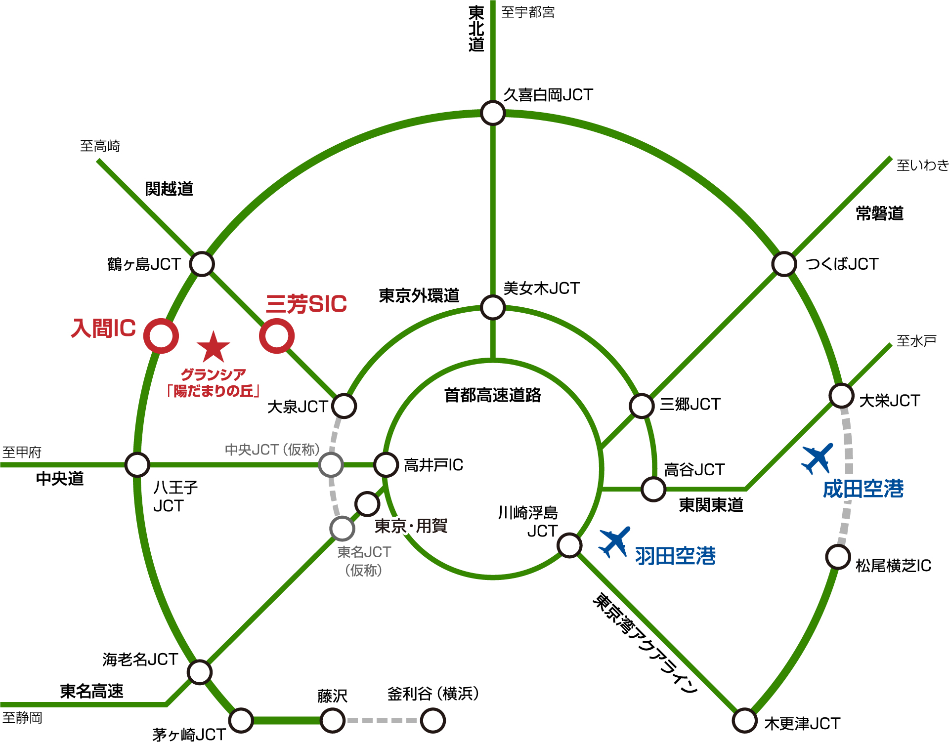 現地から圏央道・入間ICまで車で9分と便利。出張やお出かけなど、都市部や郊外へのアクセスもスムーズ。人気の軽井沢や箱根なども日帰りで愉しめます。