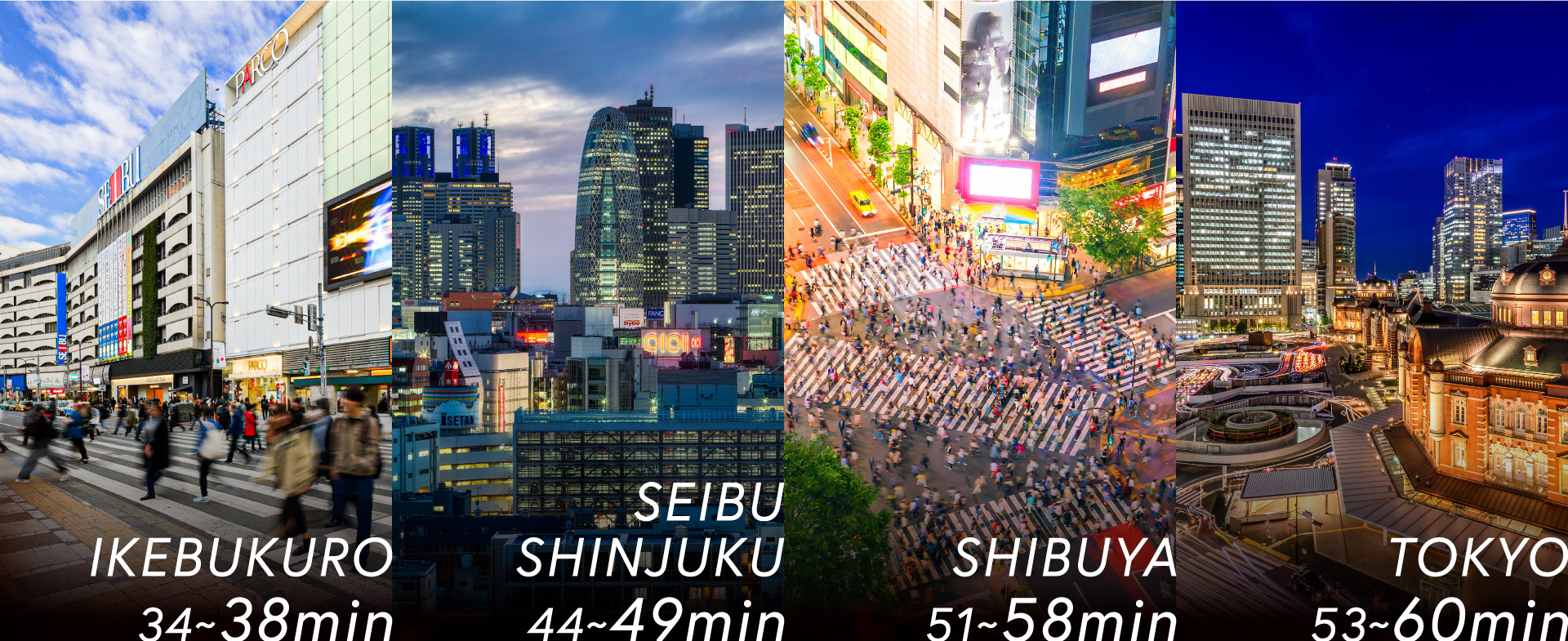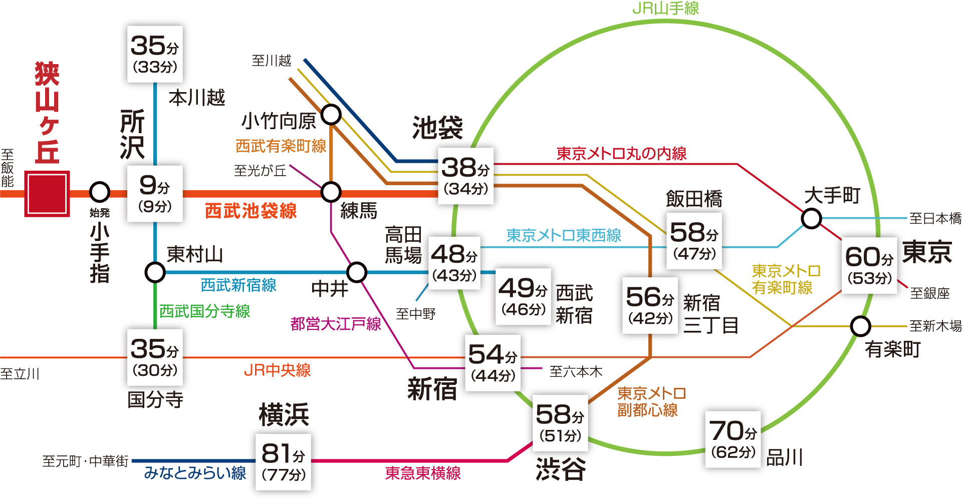 ※西武池袋線「狭山ヶ丘」駅より ■所沢駅へは西武池袋線快速利用[直通]■本川越駅へは通勤時:西武池袋線通勤急行利用、所沢駅で西武新宿線乗換/平常時:西武池袋線快速利用、所沢駅で西武新宿線乗換■国分寺駅へは通勤時:西武池袋線快速利用、所沢駅で西武新宿線急行乗換、東村山駅で西武国分寺線乗換/平常時:西武池袋線急行利用、所沢駅で西武新宿線急行乗換、東村山駅で西武国分寺線乗換■池袋駅へは西武池袋線急行利用[直通]■高田馬場駅へは通勤時:西武池袋線快速利用、所沢駅で西武新宿線急行乗換/平常時:西武池袋線急行利用、池袋駅で山手線乗換■西武新宿駅へは通勤時:西武池袋線快速利用、所沢駅で西武新宿線急行乗換、小平駅で拝島ライナー乗換/平常時:西武池袋線準急利用、所沢駅で西武新宿線急行乗換■新宿駅へは通勤時:西武池袋線快速利用、練馬駅で都営大江戸線乗換/平常時:西武池袋線急行利用、池袋駅で湘南新宿ライン乗換■新宿三丁目駅へは通勤時:西武池袋線通勤急行利用、石神井公園駅で西武池袋線準急乗換、小竹向原駅で東京メトロ副都心線乗換/平常時:西武池袋線Fライナー快速急行[東京メトロ副都心線直通]■飯田橋駅へは通勤時・平常時:西武池袋線急行利用、池袋駅で東京メトロ有楽町線乗換■品川駅へは通勤時:西武池袋線急行利用、池袋駅で埼京線乗換、大崎駅で山手線乗換/平常時:西武池袋線急行利用、池袋駅で湘南新宿ライン乗換、大崎駅で山手線乗換■東京駅へは通勤時・平常時:西武池袋線急行利用、池袋駅で東京メトロ丸の内線乗換■渋谷駅へは通勤時:西武池袋線急行利用、池袋駅で埼京線乗換/平常時:西武池袋線Fライナー快速急行利用[東京メトロ副都心線直通]■横浜駅へは通勤時:西武池袋線快速利用、池袋駅で湘南新宿ライン乗換/平常時:西武池袋線Fライナー快速急行利用[東京メトロ副都心線直通] ※掲載の電車所要時間は、乗換え時間等を含んだ通勤時のもので時間帯により異なります。括弧表記の時間は日中平常時のものです。(日中時9:31~16:30着、通勤時7:00~9:30着)※2024年12月駅すぱあと調べ