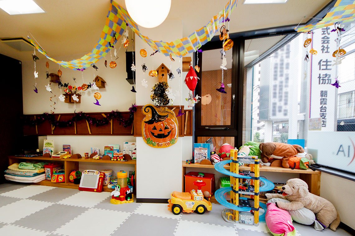 朝霞台支店の店舗内、キッズスペースをハロウィン向けにちょっと模様替えしました。