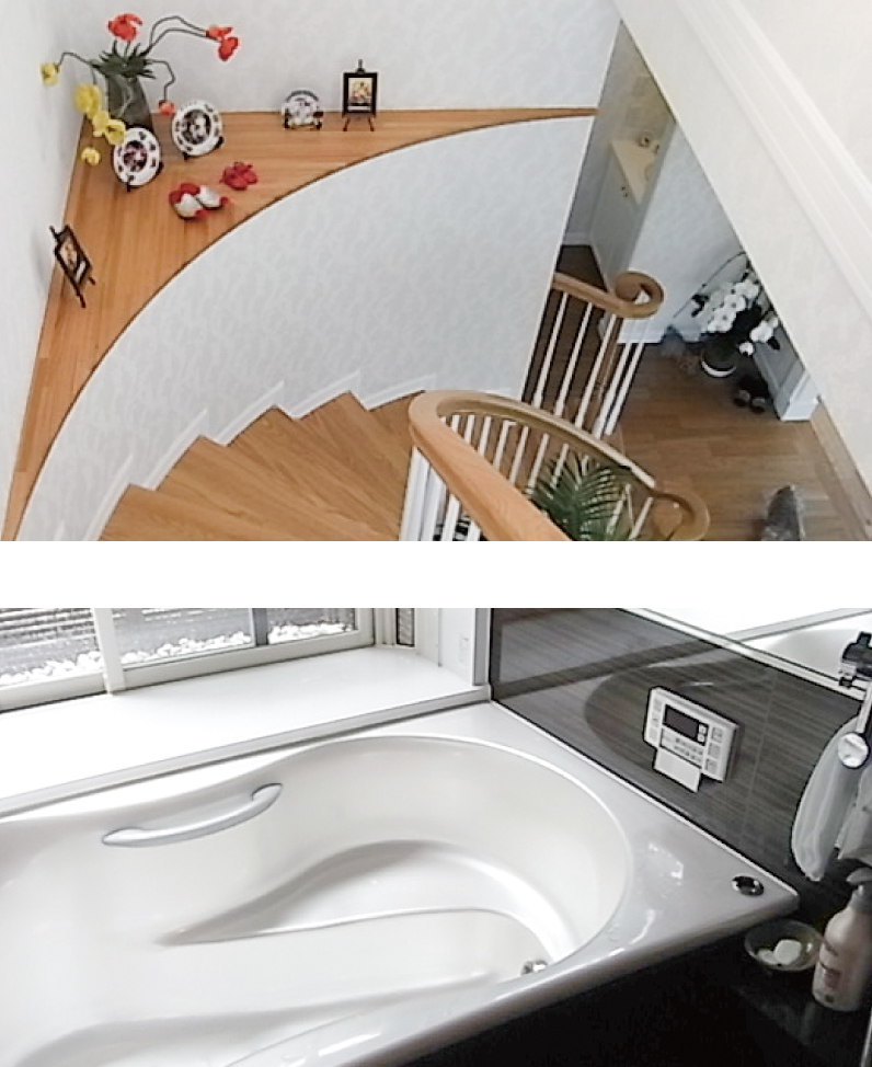 「一番こだわったのは、階段部分と坪庭が見えるバスルーム、風見鶏を入れた外観です。あとは妻にまかせて、好きなようにこの家をつくりました。階段はラインをキレイに見せたくて、曲線と広がりにこだわりました。入り口から見える雰囲気は満足です。手すりだけでも入念な打合せを何度か行い、階段の余ったスペースは工夫して収納スペースにしました。これも住協さんのアイディアです。だけど、これだけ手を加えたのになんと、予算はオーバーしていません」