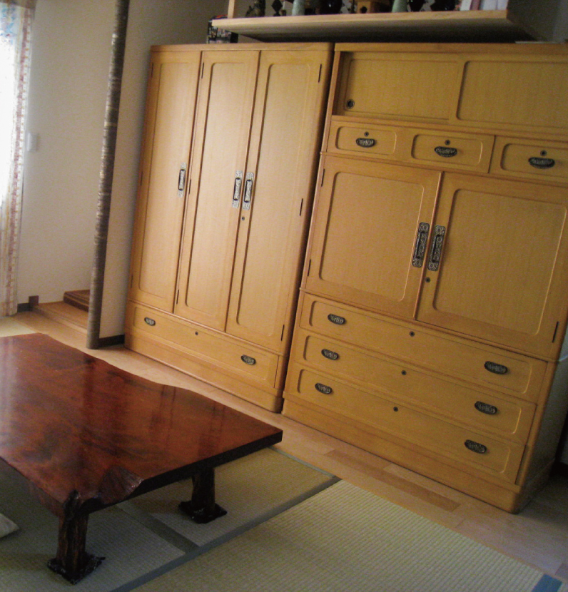 「とりわけ1階の和室には、我が家の歴史が詰まっています。レトロな雰囲気のタンスは、実は妻の婚礼家具。『この機会に処分してもかまわない』と妻は言ったのですが、何といっても思い出の品ですから。これらの品を置けるような部屋を作ればいいと…。設計の藤本さんがよく考えてくださいました。タンスの高さと天井の高さとのバランスがよく、タンスの上方に位置する神棚とも大変合っています。その横にある床の間も、我が家ならではの空間としてこだわりました。床の間の壁面に飾ってある部材は、前の家の床柱の一部なんですよ。部屋に置いてある大きな材木の切り出しテーブルも、前の家から持ってきたものです。さらに、玄関先に私が設えた坪庭風エクステリアの蹲踞(つくばい=手水鉢)も、以前の家にあった年代物。代々受け継がれてきた家の残せるものは残したい、という思いを叶えた新居になりました」