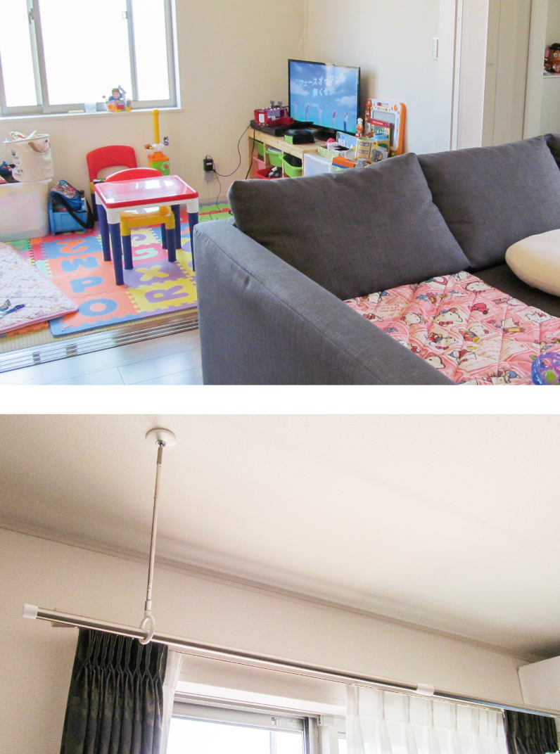 「一番こだわったのは、子どもたちがのびのび動ける間取ですね。リビング横に畳コーナーを設け、遊べるスペースを作りました。対面式キッチンは透明タイプの仕切りを選んだので、料理をしていても子どもたちの様子がわかります。また、洗濯物が1階に干せるウッドデッキ、便利な室内干しの“ホスクリーン”、家族とコミュニュケーションしやすいリビング階段、大容量のクローゼット収納など、機能面にも気を配りました。実は、私たちより前に妻の実家でも注文住宅を建てたのですが、あとから「あれ、欲しかったよね」といった設備が結構あったので、参考にしたんです(笑)」
