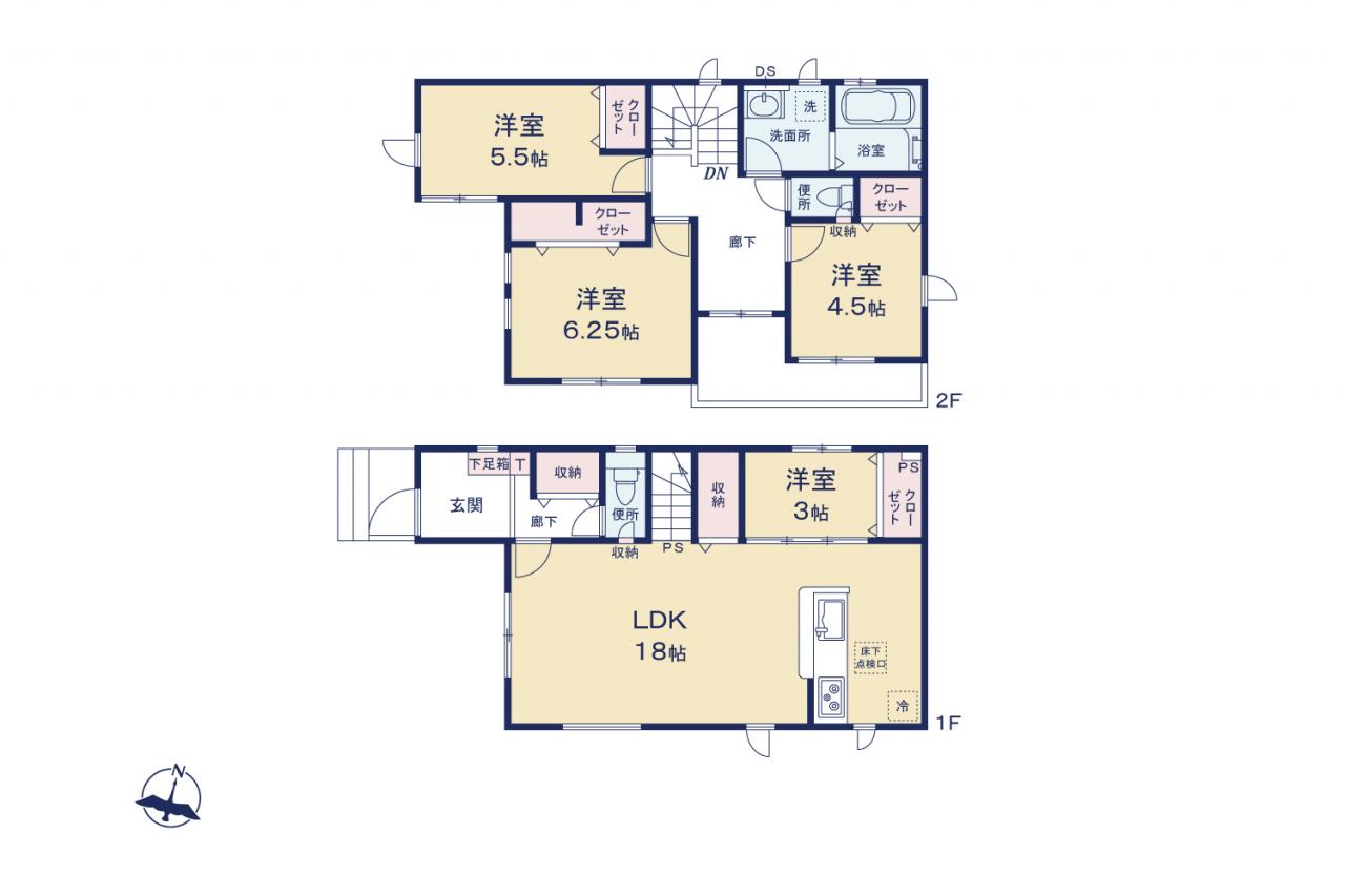 | 設備 | 都市ガス / 公営水道 / 汚水:公共下水 始発駅 / 2階建 / 2面採光 / LDK15畳以上 / フローリング / 全居室フローリング / リビング階段 / 全居室収納 / 床下収納 / クローゼット / シューズボックス / システムキッチン / 対面式キッチン / カウンターキッチン / 浴室乾燥機 / 浴室に窓 / シャワー付洗面化粧台 / トイレ2ヶ所 / 温水洗浄便座 / バルコニー / 複層ガラス / 駐車2台可 / スーパー 徒歩10分以内 / 隣家との間隔が大きい / 隣家との間隔が広い / 即入居可 / 都市ガス |