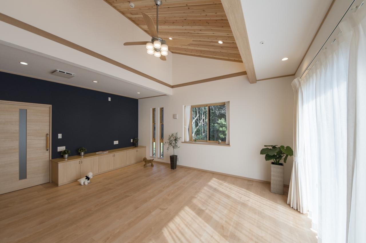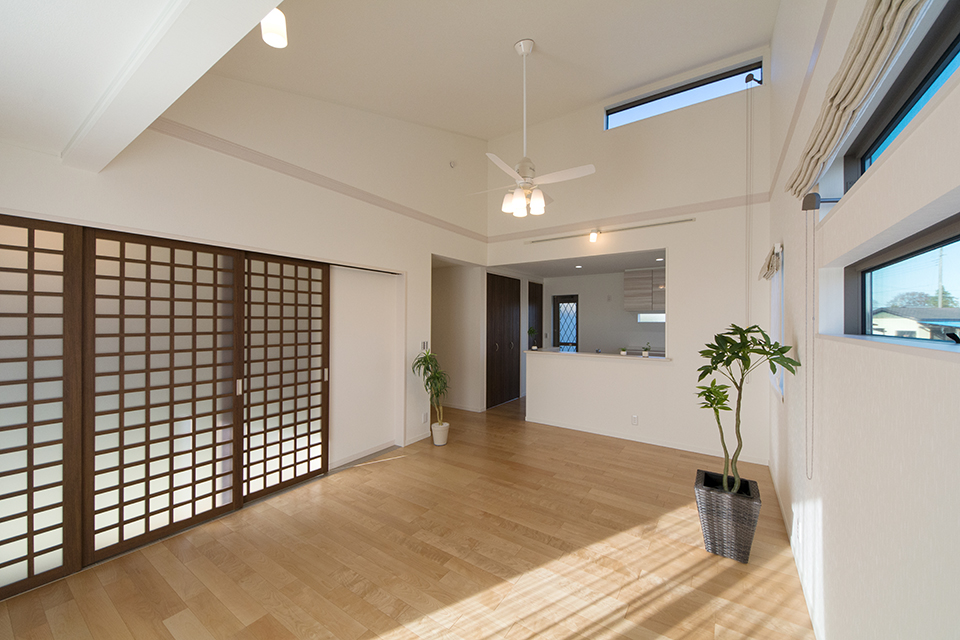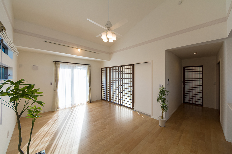 住協建設施工例②/開放感を円室する勾配天井を採用。空気を循環させるシーリングファンを設置しております。