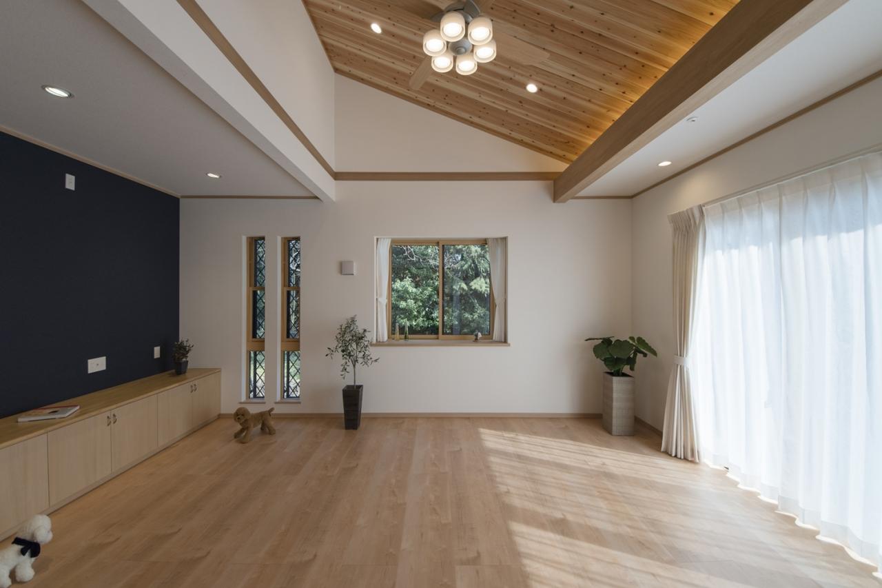 住協建設施工例①/天井に床をウッド調に。まるで森林浴をしているようなリビングダイニング。