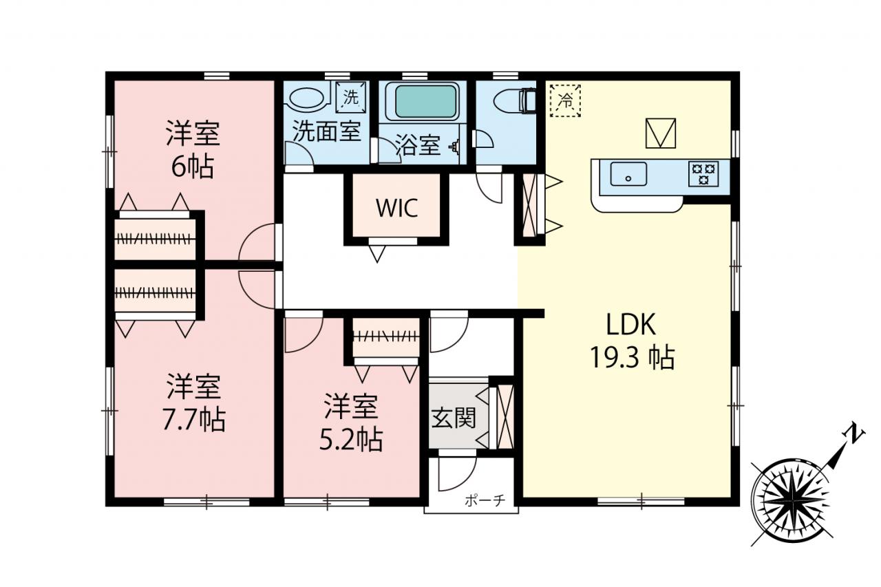 ご家族がいつも近くに感じられ、寂しさを感じない平屋の新邸が誕生!2階建てや3階建てもいいですが、平屋はどこか懐かしくもあり、落ち着きます☆平屋だからこその無駄のない間取で動きやすく開放感もプラス!広々としたリビング空間に会話の弾む対面キッチン、ホールにはご家族全員で使う事が出来るWICも備わっています。