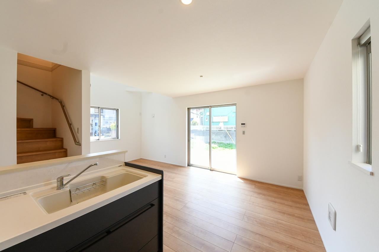 キッチンから、リビング、ダイニングが見渡せて、とても開放的で一体感があります。