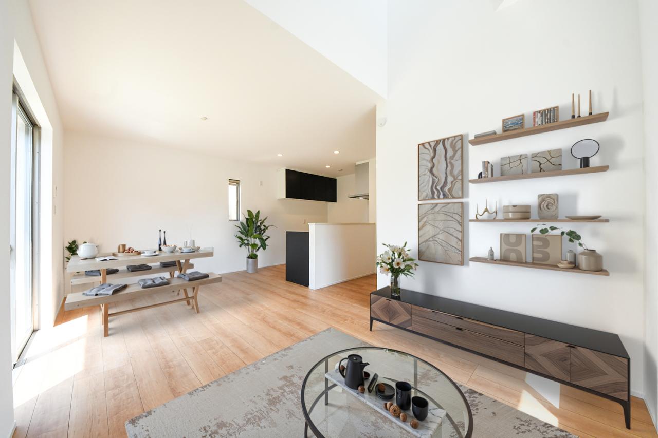 吹抜を採用した光に溢れる開放的なリビング。お子様の帰宅が分かるリビングイン階段を採用し、「ただいま」や「おかえり」の笑顔が自然と生まれる間取りです(家具はCGによるイメージです)