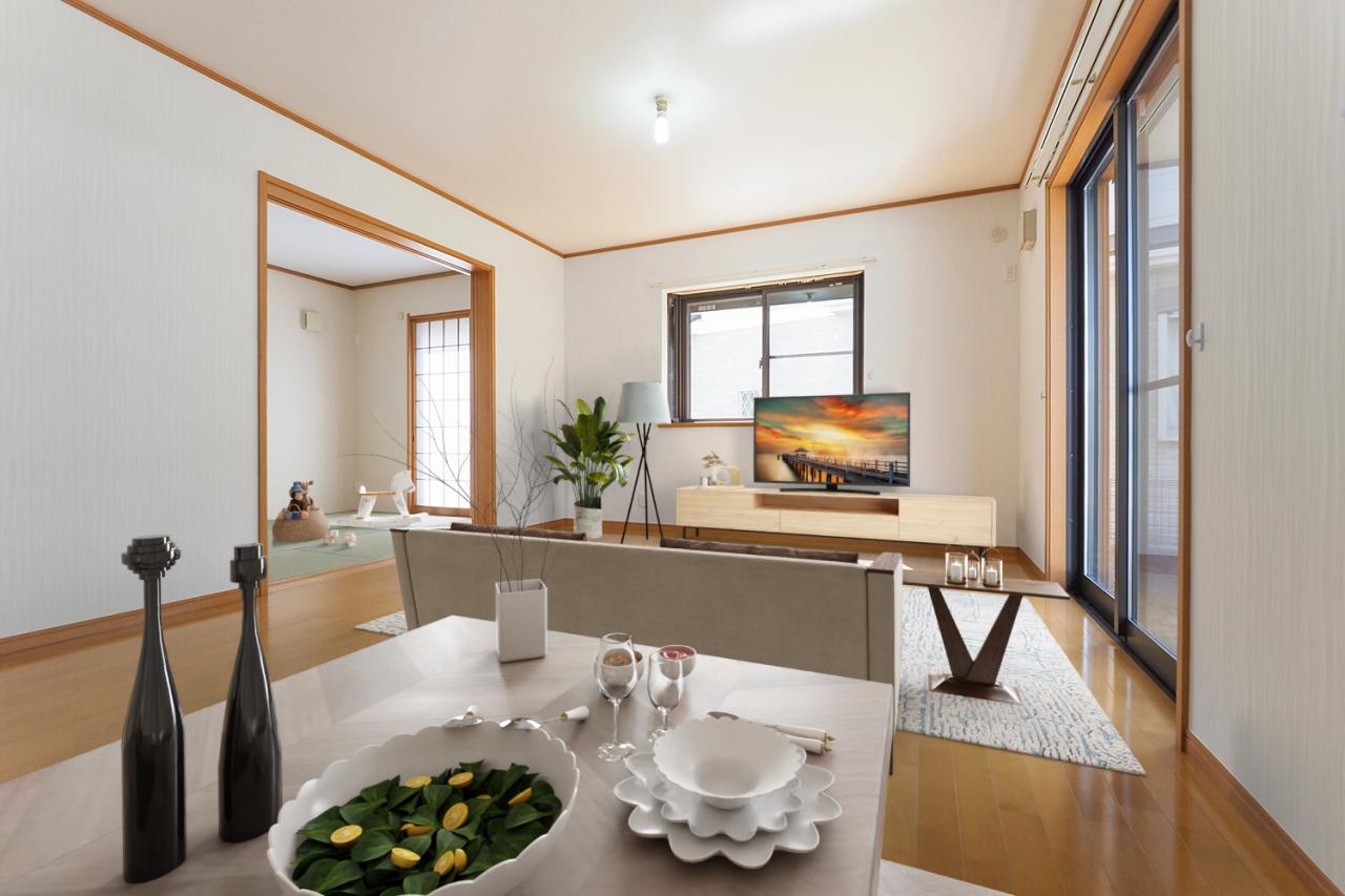 【LDK16.75帖】木肌の美しさや手触りが心地よい、ナチュラルなリビング。和室も隣接する使い勝手の良い空間です(家具はCGによるイメージです)
