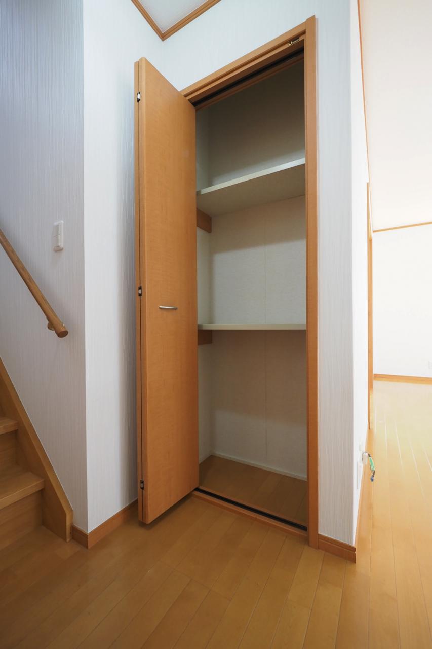 日用品や掃除用具をしまうのに便利な階段横収納。