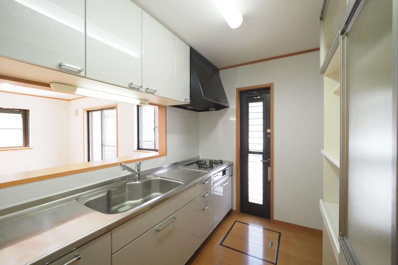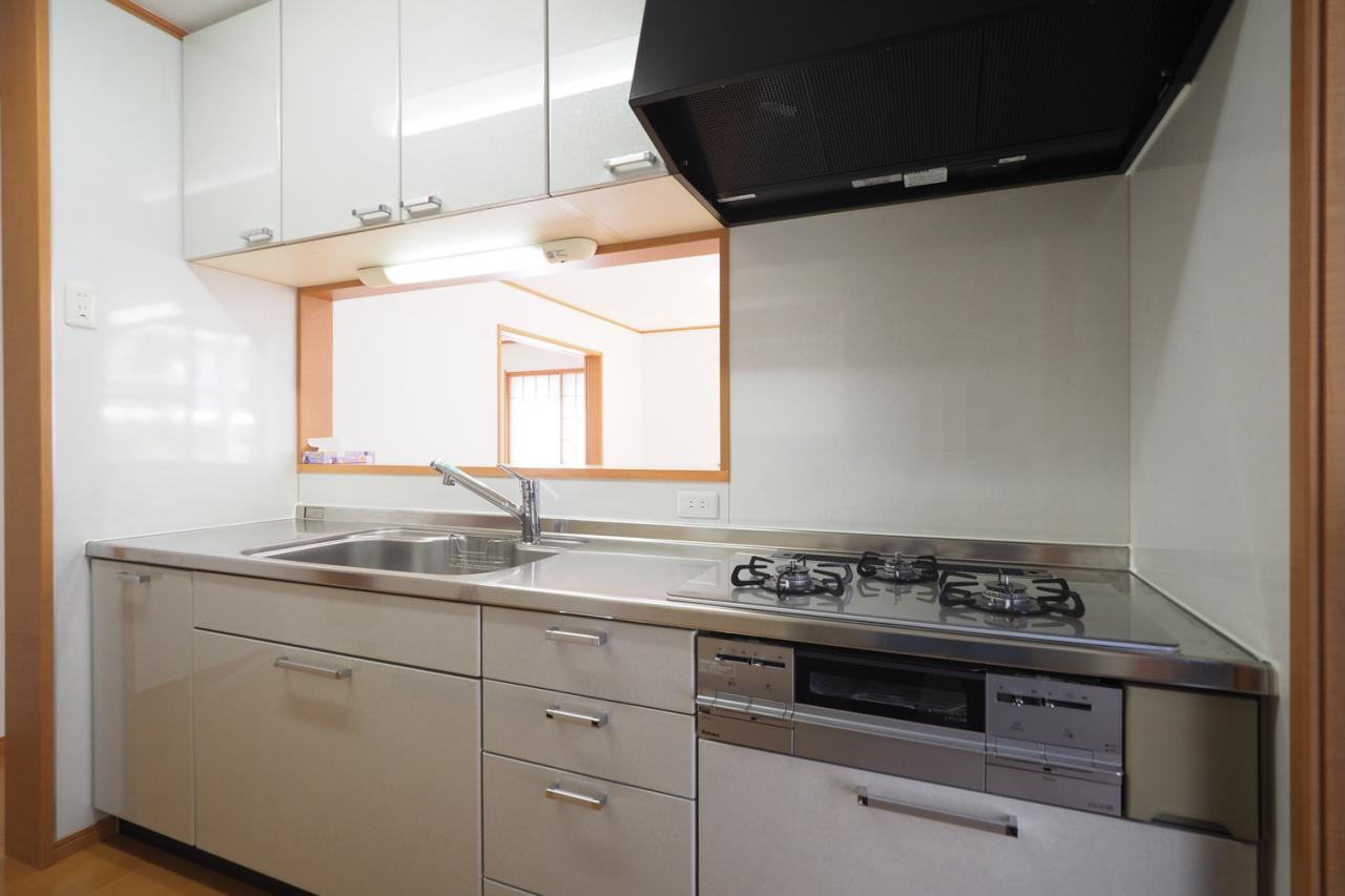 【対面キッチン】キッチンから、リビング、ダイニングが見渡せて、とても開放的で一体感があります。水回り設備もリフォームでクリーニング済みで快適です