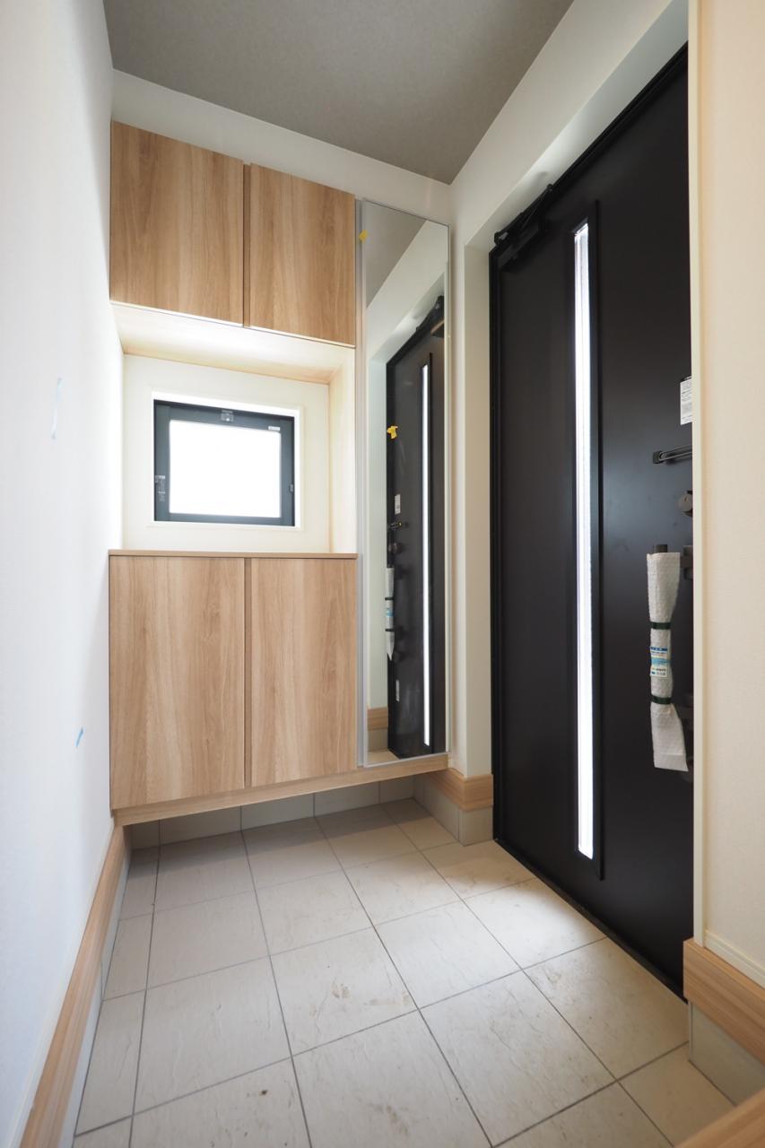 靴を履いたまま全身チェック可能のシューズボックスを設えた玄関。