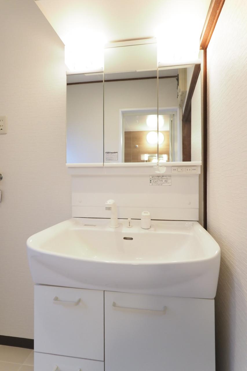 広めのボウル、シャワー機能付きで使い勝手の良い洗面化粧台。