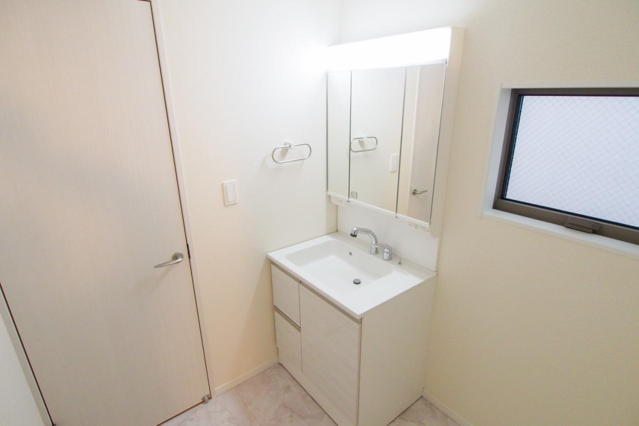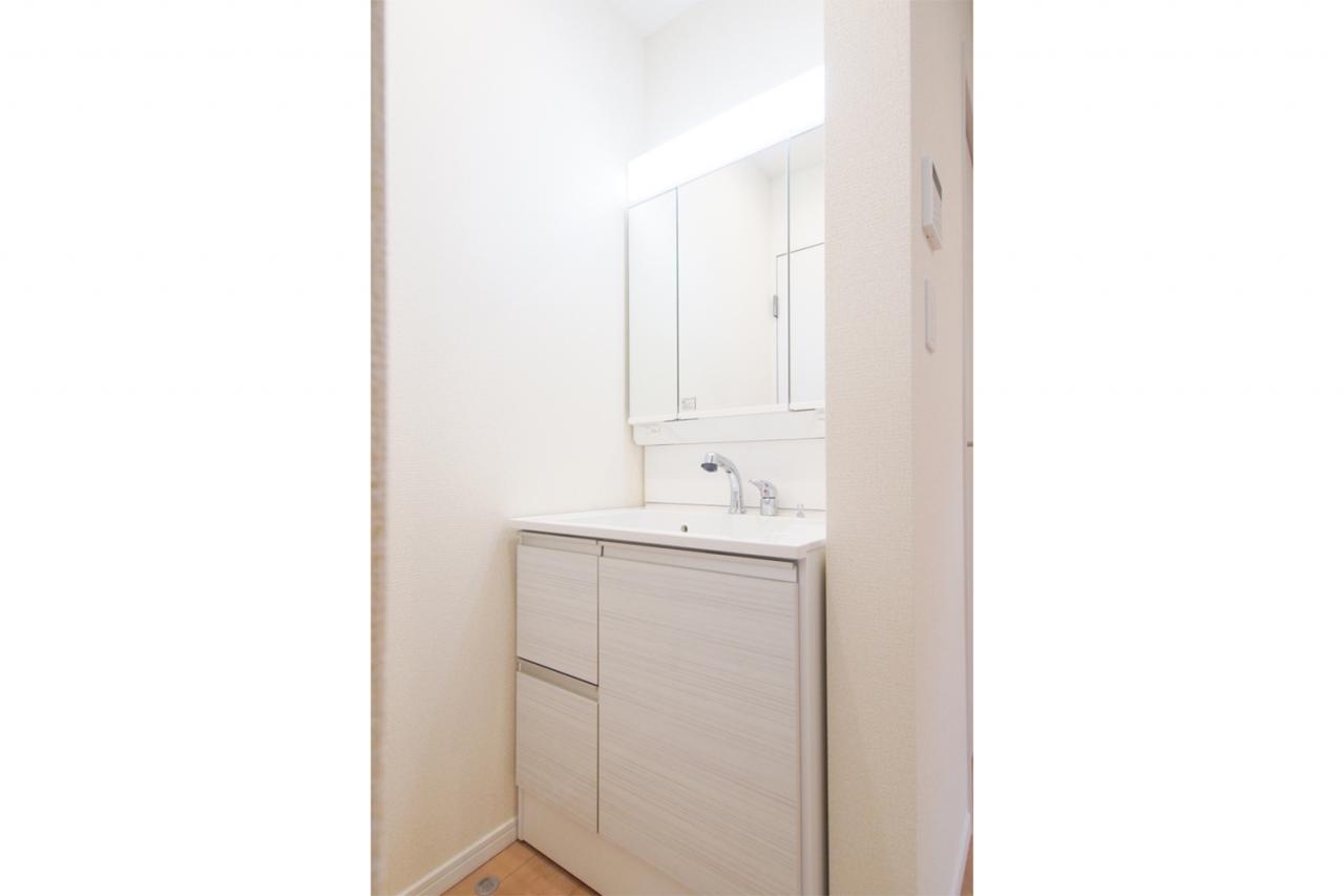 ■2号棟/サニタリースペース/三面鏡の裏に収納空間を設け、家族一人一人の毎日の使い勝手に配慮されたサニタリースペース