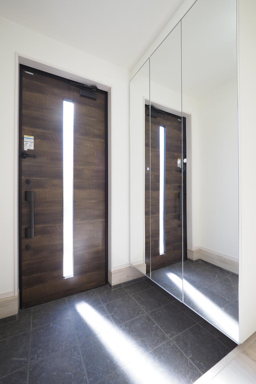 靴を履いたまま全身チェックできるミラー付き収納を設えた玄関。