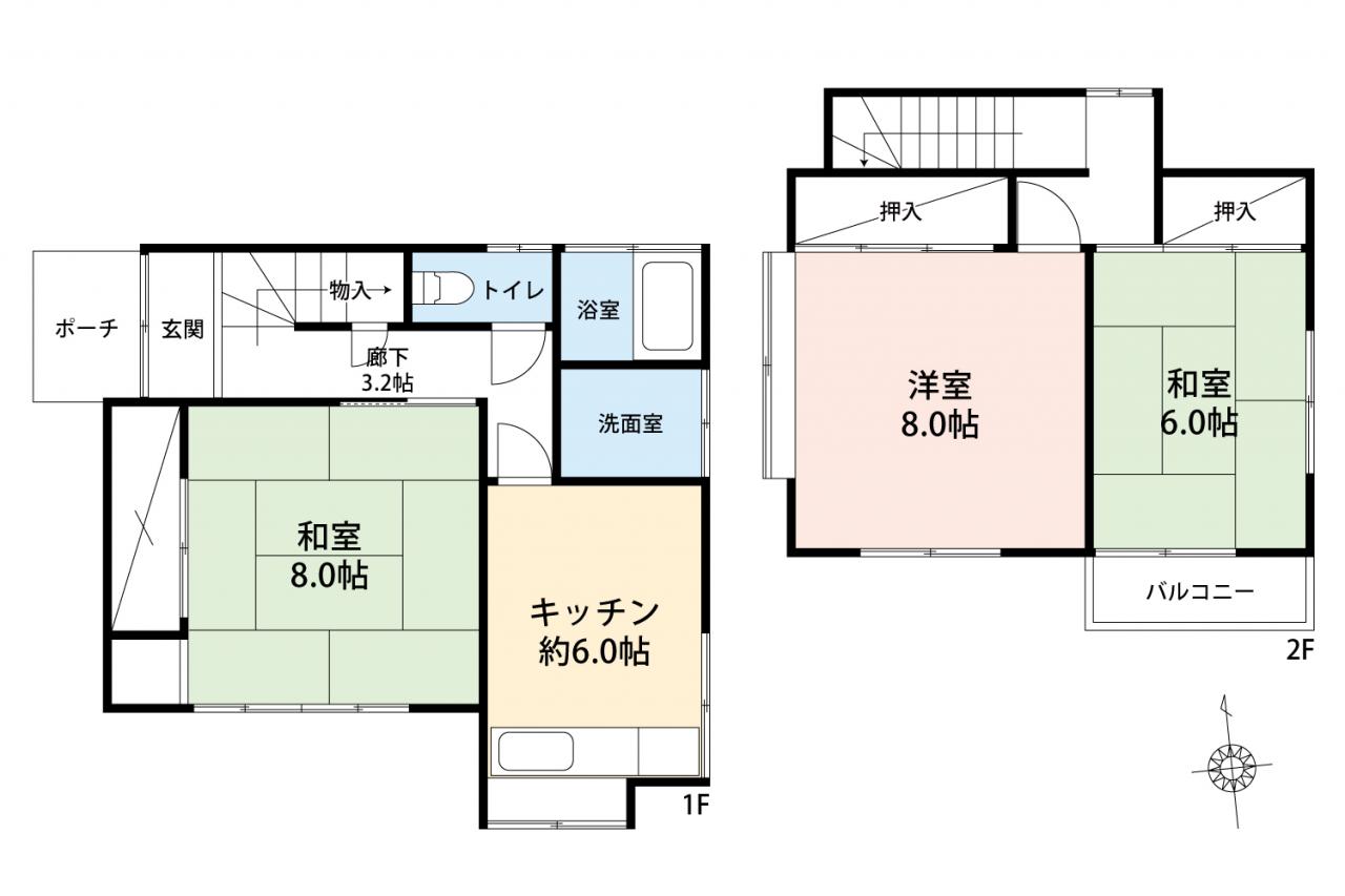 | 設備 | 都市ガス / 公営水道 / 汚水:公共下水 整形地 / 2階建 / 陽当り良好 / 出窓 / 全居室6畳以上 / 和室 / 全居室収納 / 浴室に窓 / 洗面所独立 / バルコニー / 小学校 徒歩10分以内 / 隣家との間隔が大きい / 公園 400m以内 / 都市ガス |