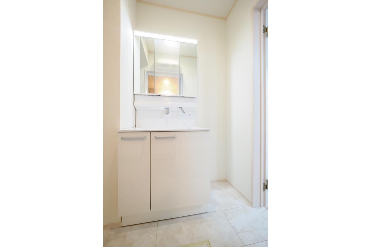 ■洗面化粧台/三面鏡の裏に収納空間を設け、家族一人一人の毎日の使い勝手にも配慮されたサニタリースペース