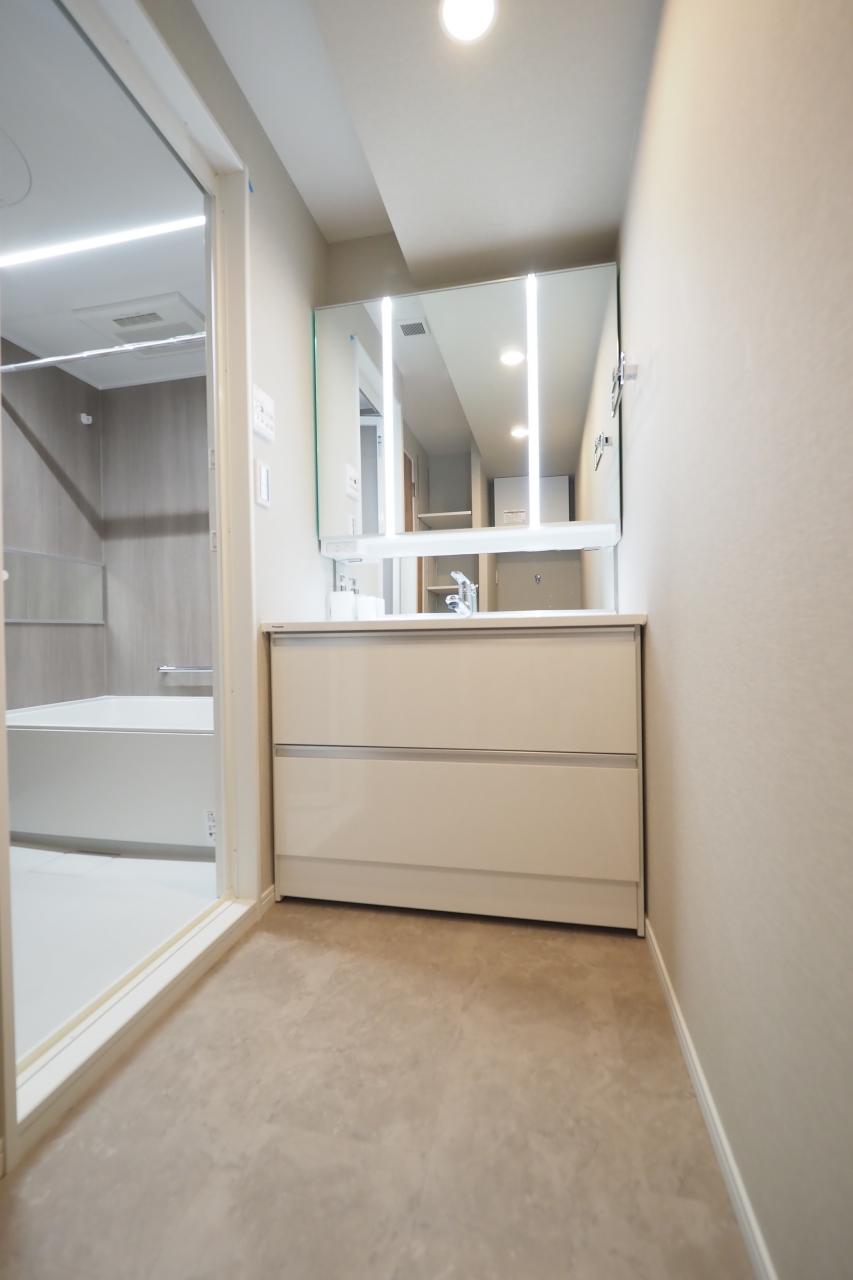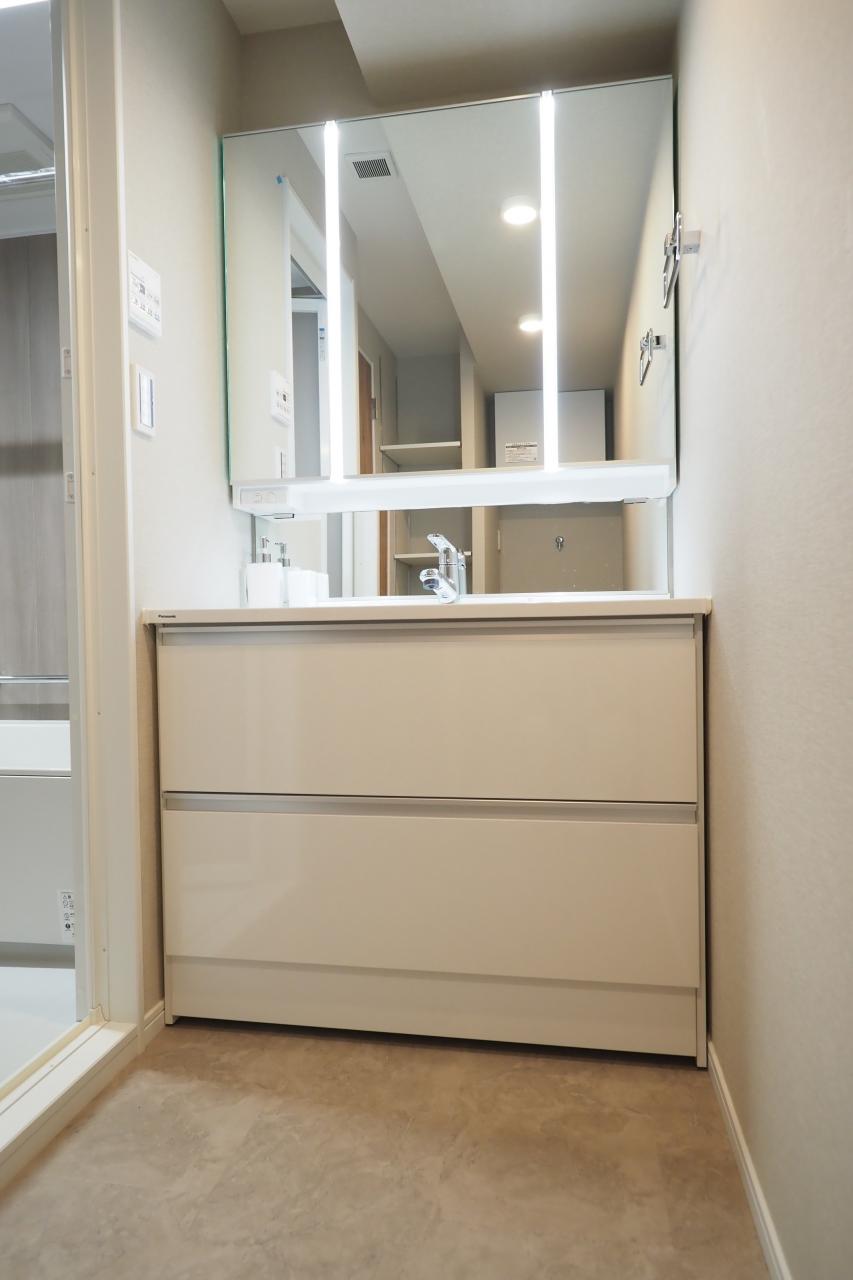 【三面鏡付きシャンプードレッサー完備】お子様の目線にも鏡が付いた洗面化粧台。自分で身だしなみを整える習慣が付けられます