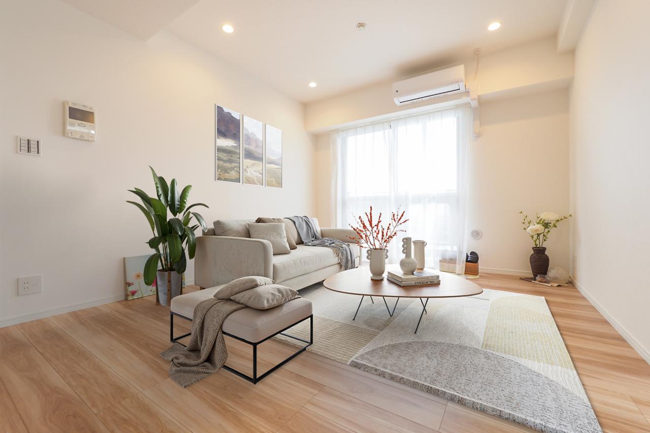 【LDK12.1帖】ナチュラルで優しい雰囲気のリビング。南面採光で陽当たりも良く家族団らんにも十分な広さでごゆっくりと家族水入らずの時間をお楽しみいただけます(家具はCGイメージです)