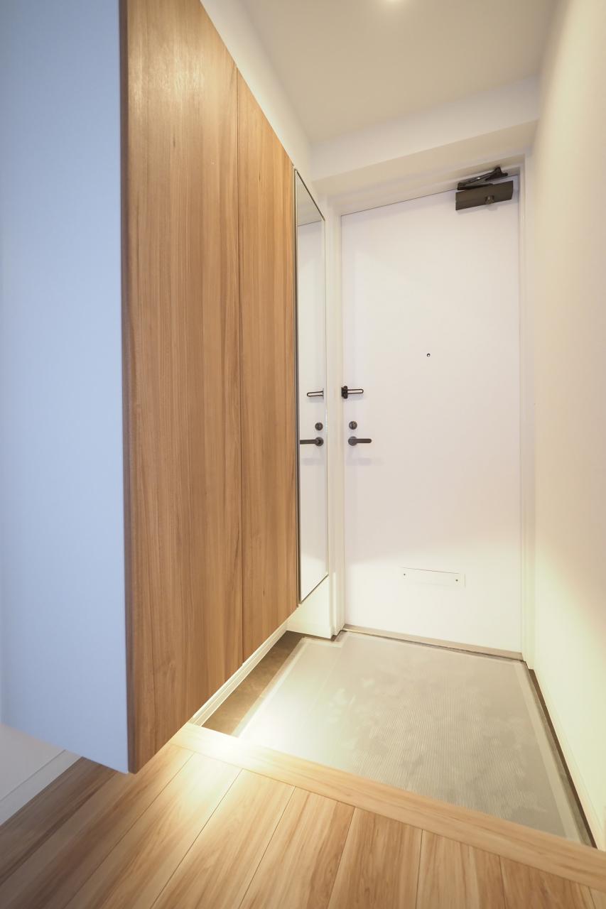 【玄関収納や照明も新規造作しました】間接照明でおしゃれな玄関です。リフォーム済みでピカピカです