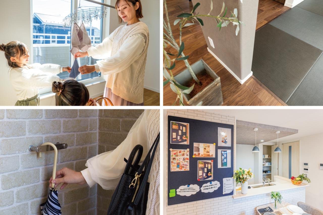 ちょっとした設備で暮らしがもっと便利に。ホスクリーンで室内干し、傘掛けフックで雨の日も安心。マグネットボードで、家族の予定や買い物メモも一目で共有(弊社施工例)