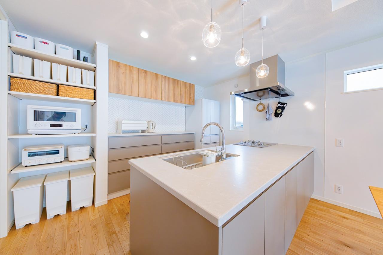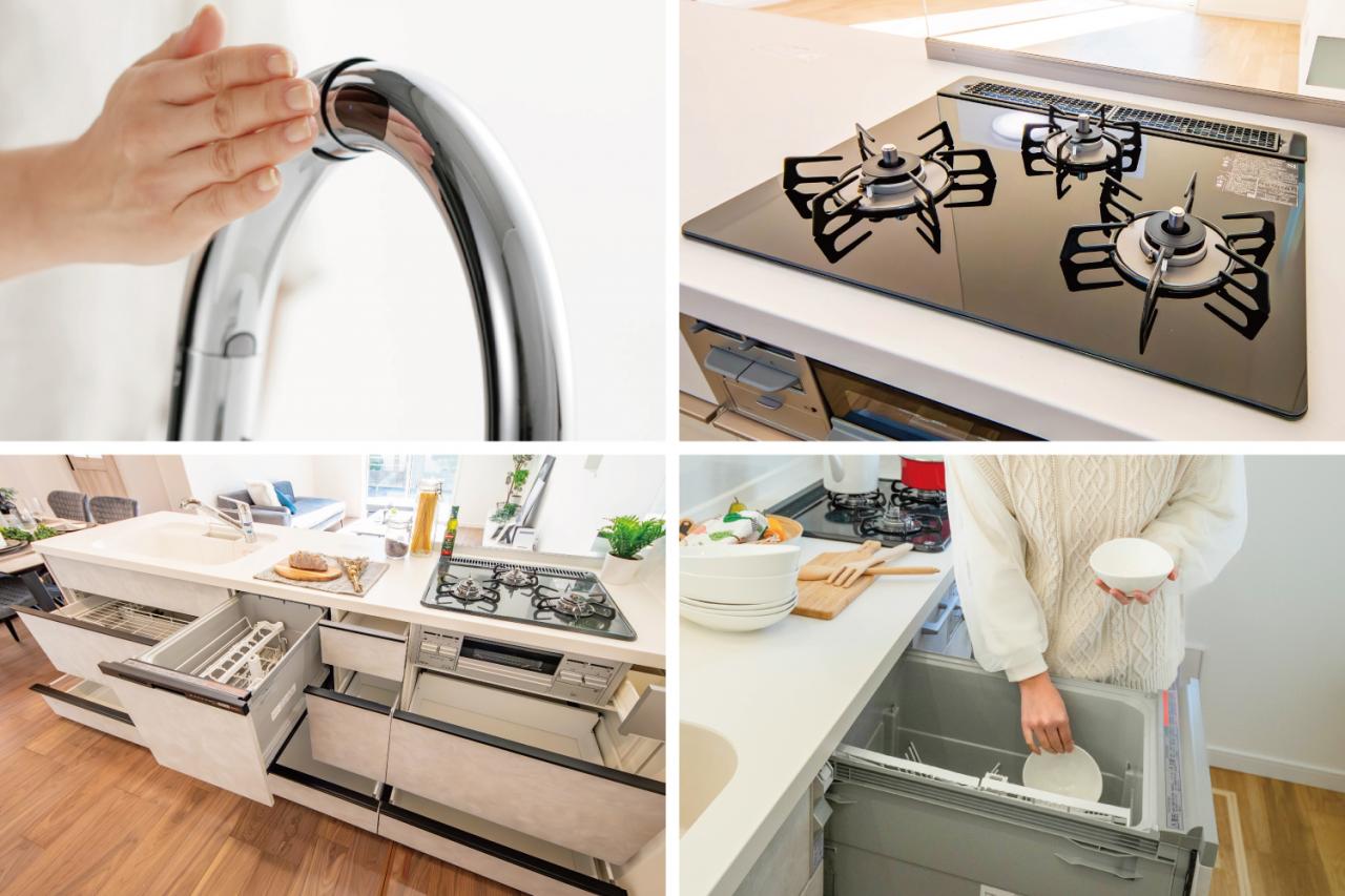 あなたのライフスタイルにぴったりなオプションを。タッチレス水栓、ガラストップコンロ、食洗機など、便利で快適なキッチン設備がございます(弊社施工例)