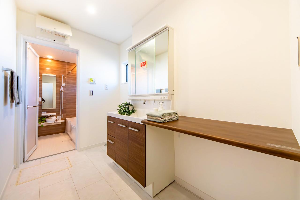 使い勝手の良いワークカウンター付きの洗面室。化粧や身支度、洗濯物の準備など、毎日の作業がスムーズに(弊社施工例)