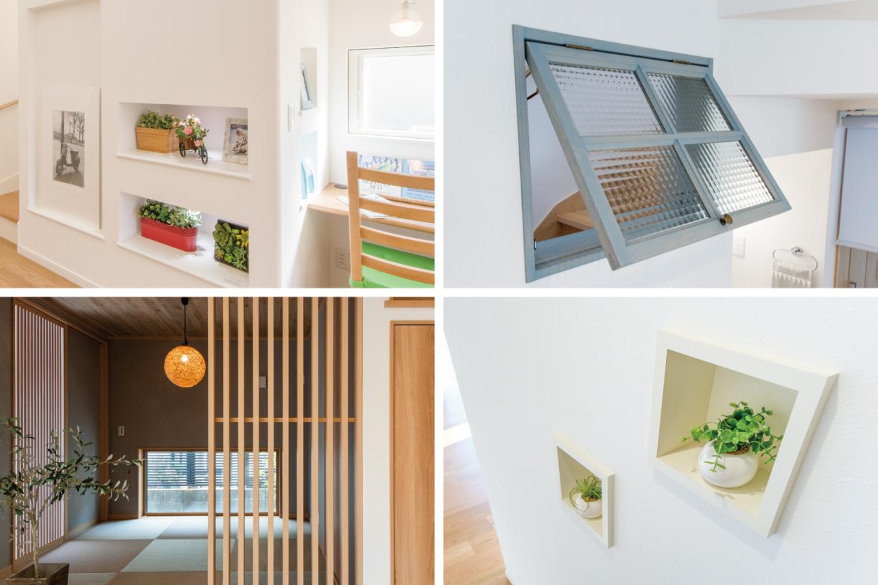 スリット格子、ニッチ、室内窓など、多彩な内装オプションで、空間にアクセントを。デザイン性と機能性を兼ね備えた、個性豊かな空間作りが可能です(弊社施工例)