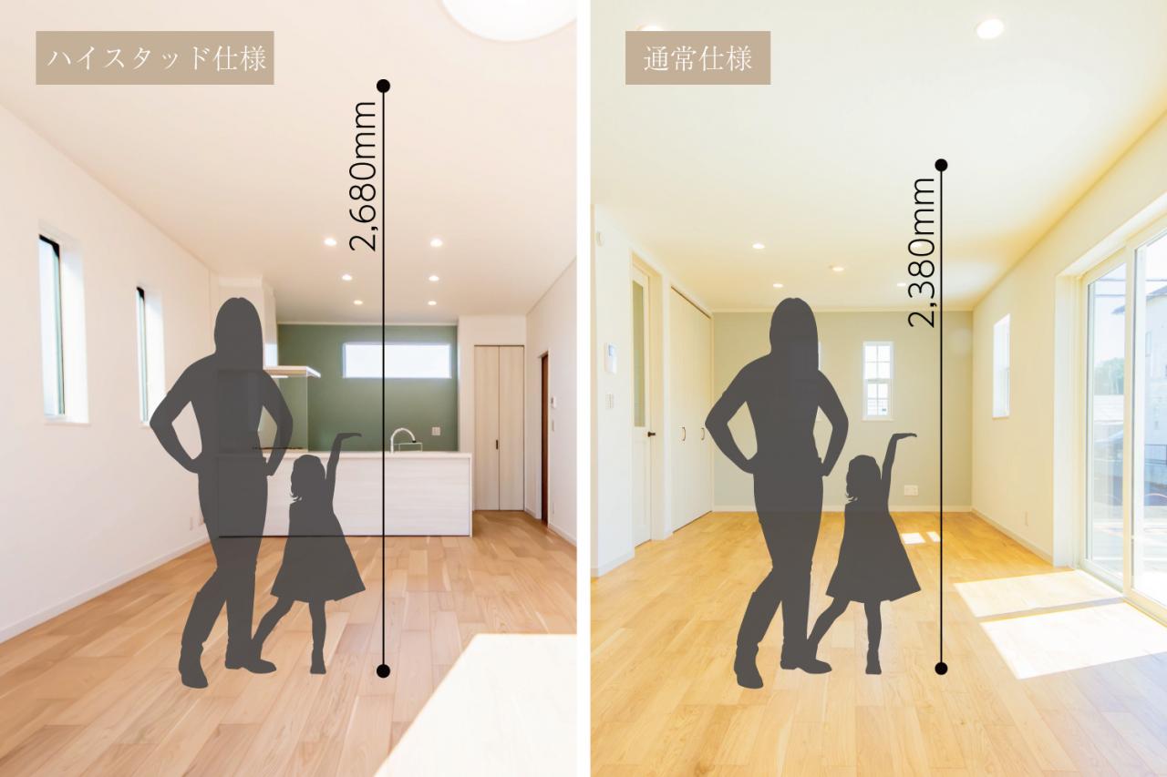 天井高2680mmのハイスタッド仕様が生む圧倒的な開放感。標準を超えた上質な空間が、日常を心地よく彩ります(弊社施工例)