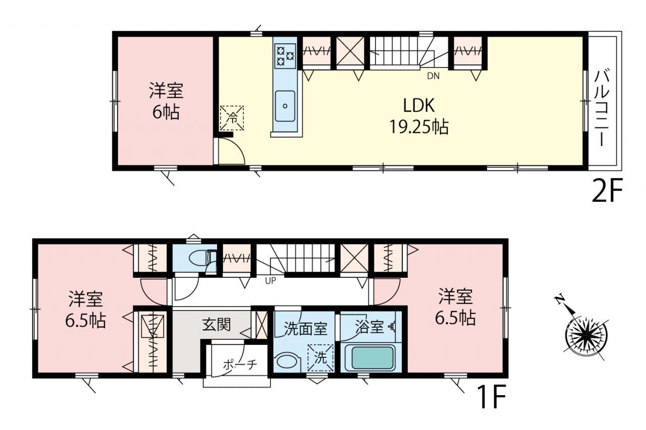 コンパクトながら全居室6帖以上収納付き、広々としたLDK19.25帖!2階LDKの間取りで日当たりを確保しております。