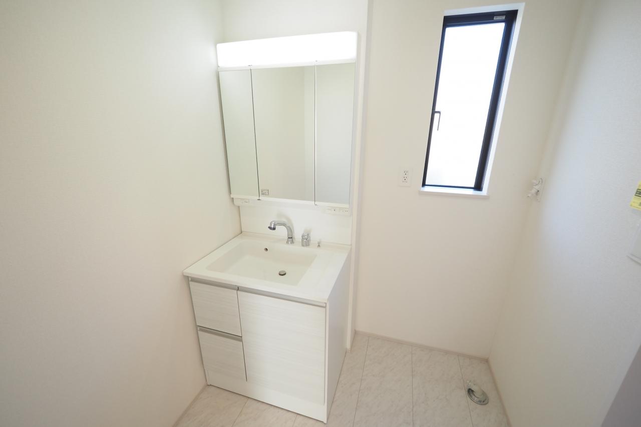 三面鏡シャンプードレッサー付きの洗面室です