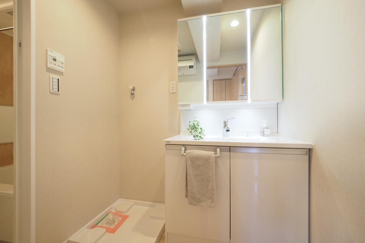 顔に影を作らない照明で身支度も思い通りに仕上げられる洗面化粧台。