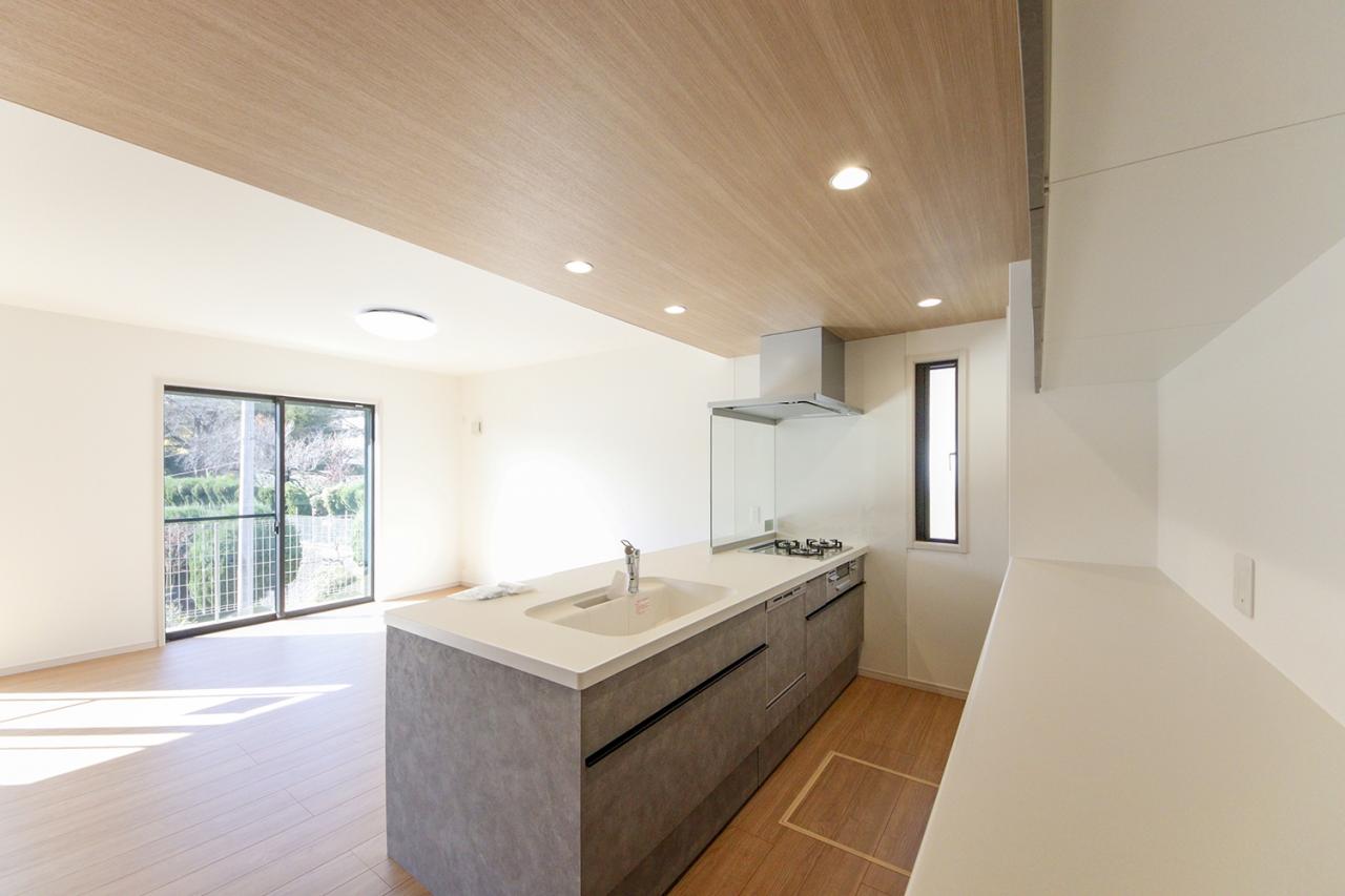 眺望や家族との会話も楽しめる開放感が心地よいキッチン。すっきりシンプルなデザインのペニンシュラ型です。