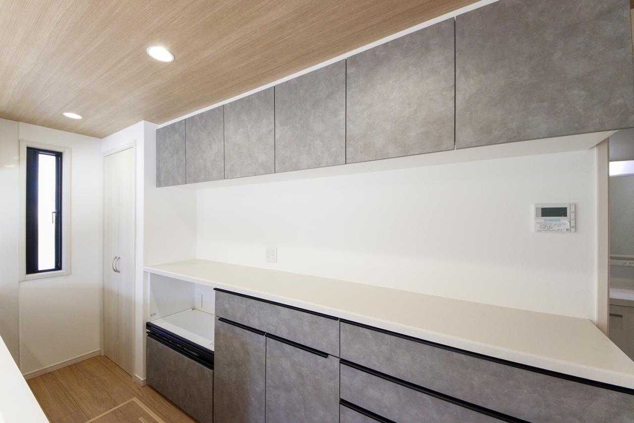 キッチン背面にはキッチンと同じ配色のカップボードを設置。