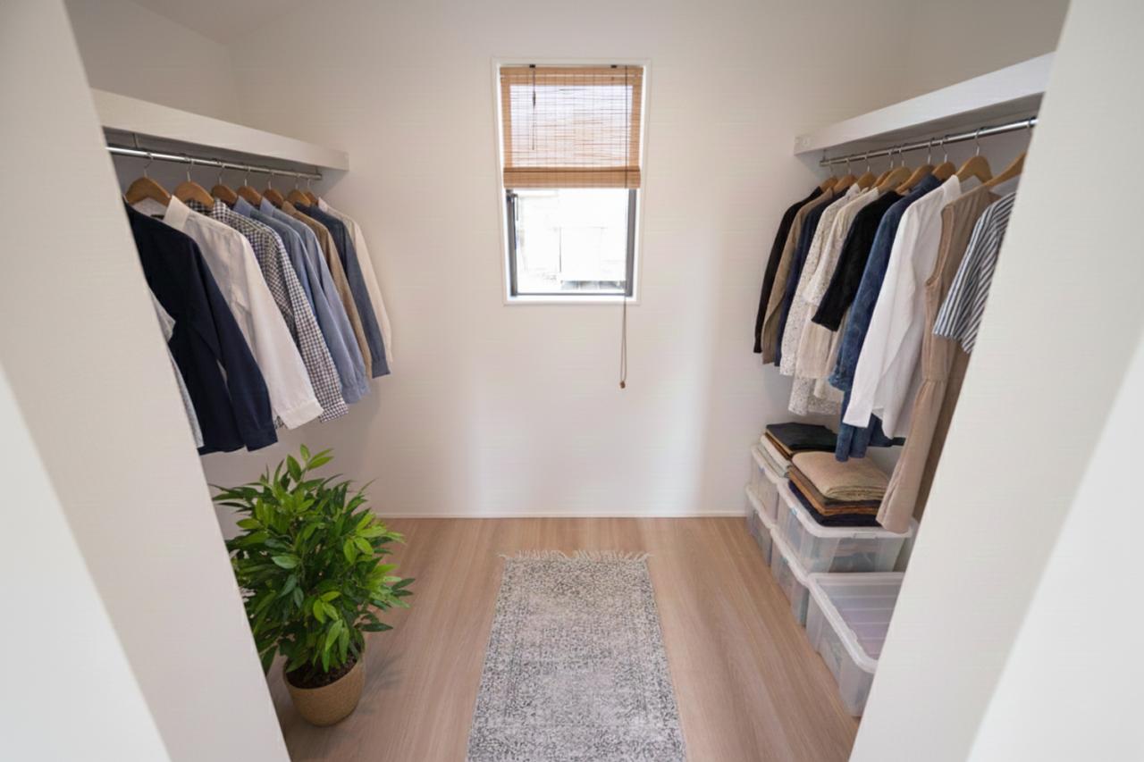 二方向にハンガーパイプを設置した、大容量のウォークインクローゼットです ※家具や小物はCGによるイメージです