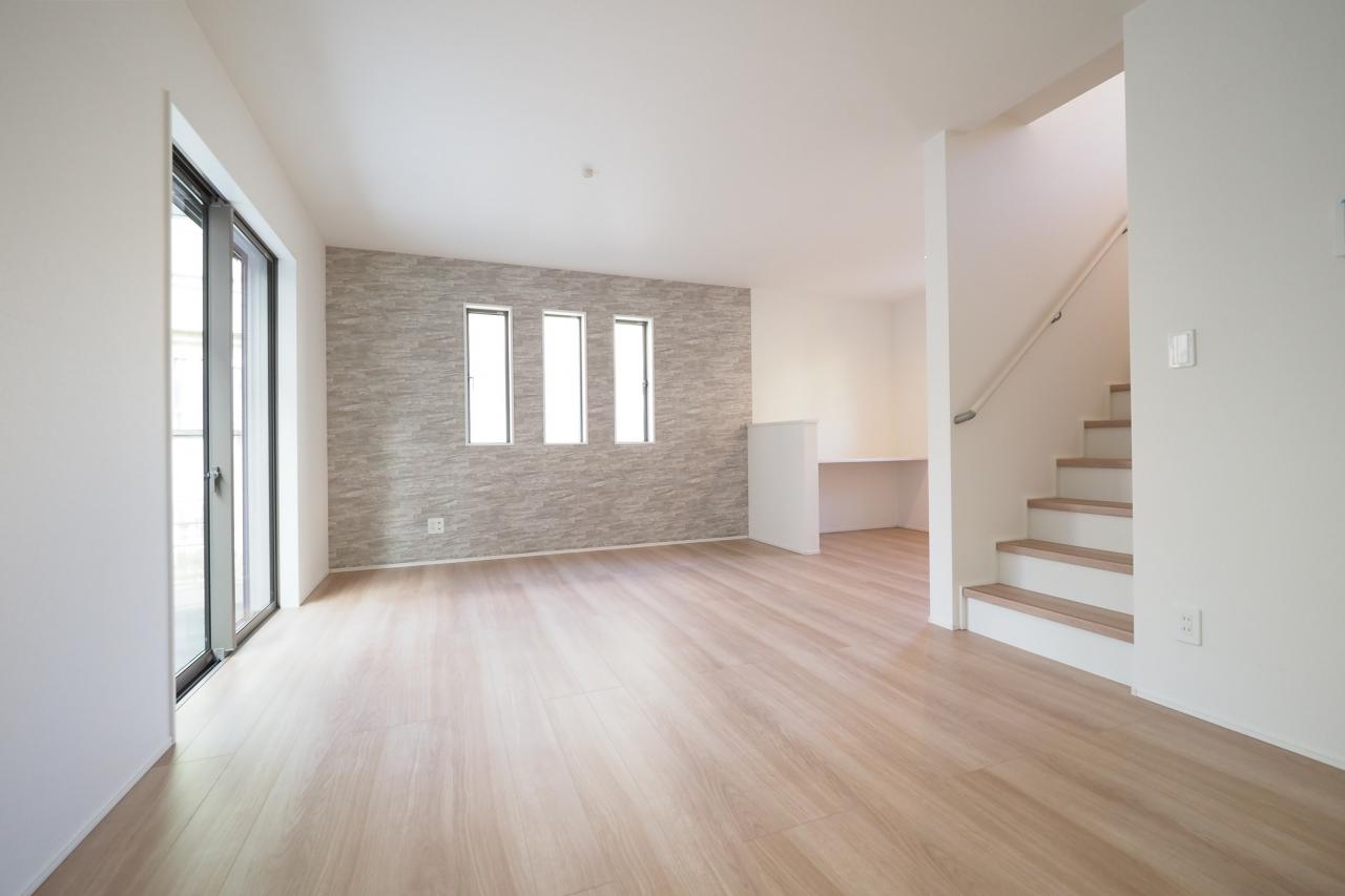 リビング階段を配した開放的なリビングルーム。アクセントクロスを設け、上質な室内に仕上げました