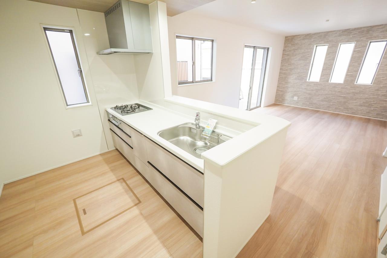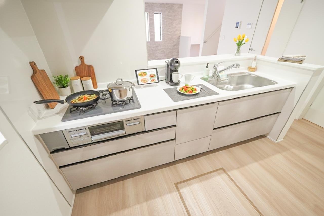 リビングを見渡せる対面式キッチンは、料理中でも家族とのコミュニケーションがとりやすく、小さなお子さんがいても安心。パントリー、ウォークインクローゼットなど充実した仕様の新築戸建です。カースペースは2台分ございます。