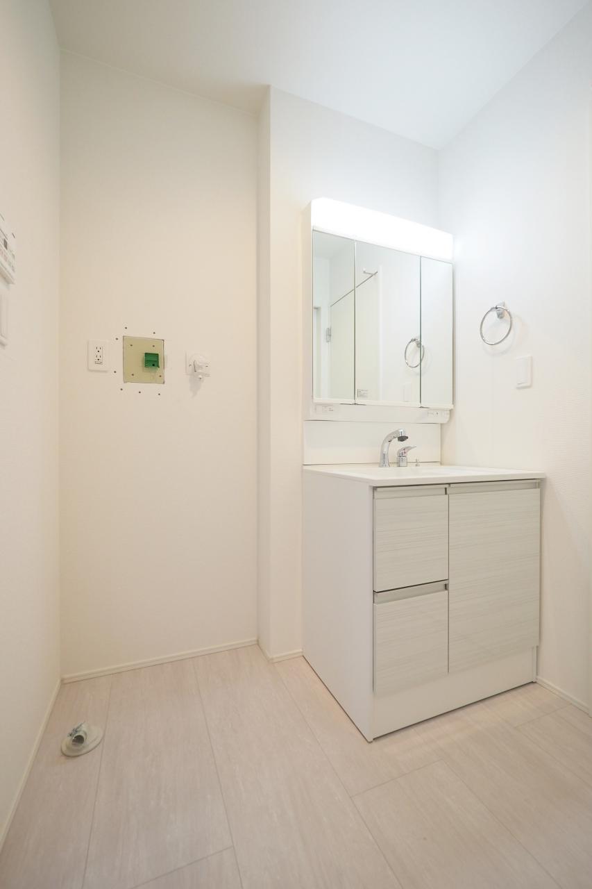 三面鏡シャンプードレッサーが設置された洗面室は、キッチンと廊下から出入りできる2way動線仕様