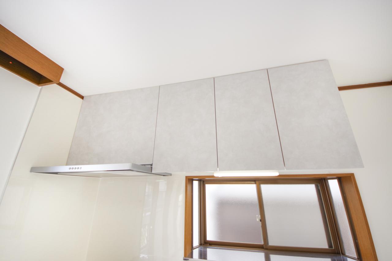 キッチンの上下に収納がございます。レンジフードは掃除がしやすいスリム型を採用しています。
