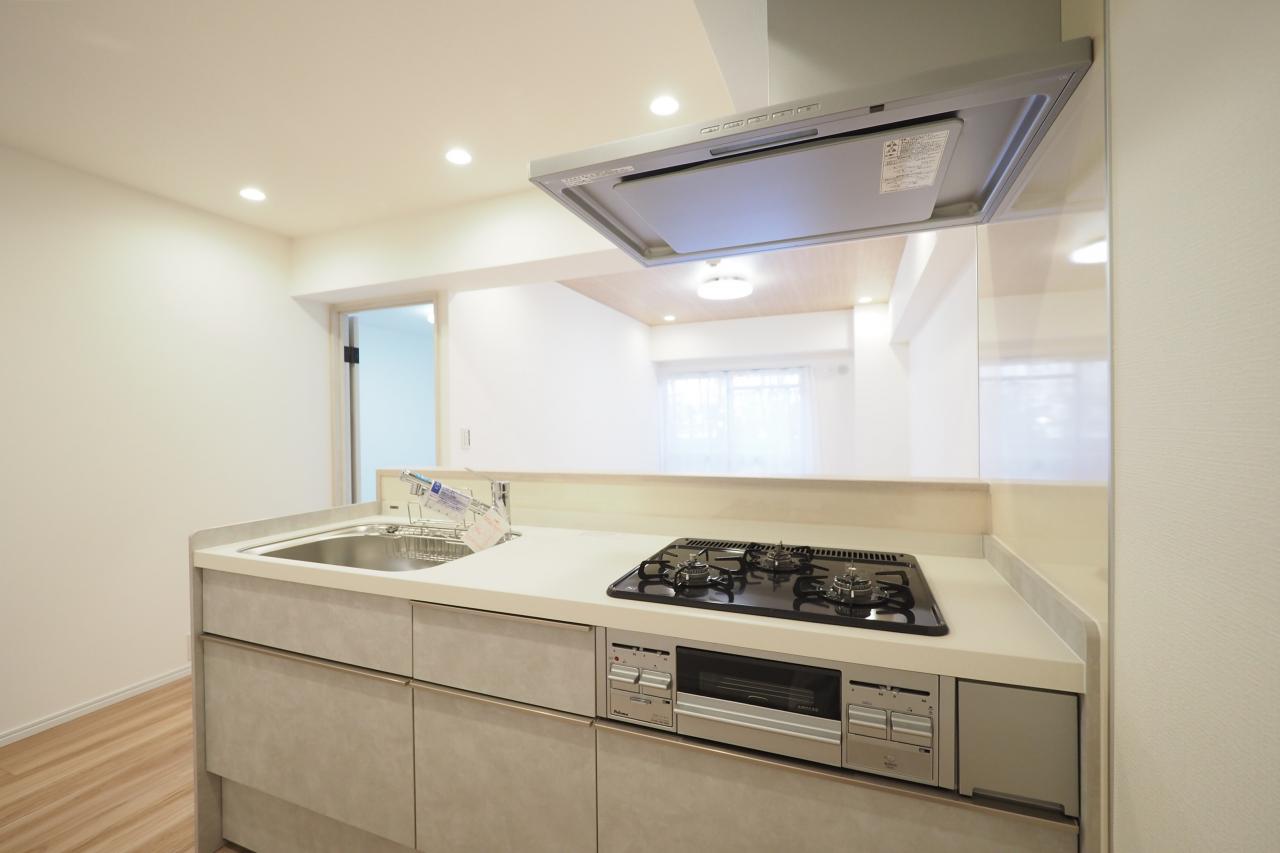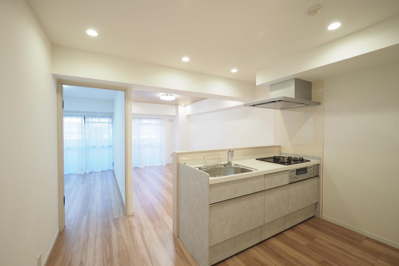 リビングを見渡せる対面式キッチンは、料理中でも家族とのコミュニケーションがとりやすく、小さなお子様がいても安心。1階の角部屋なので足音の配慮も必要なし!