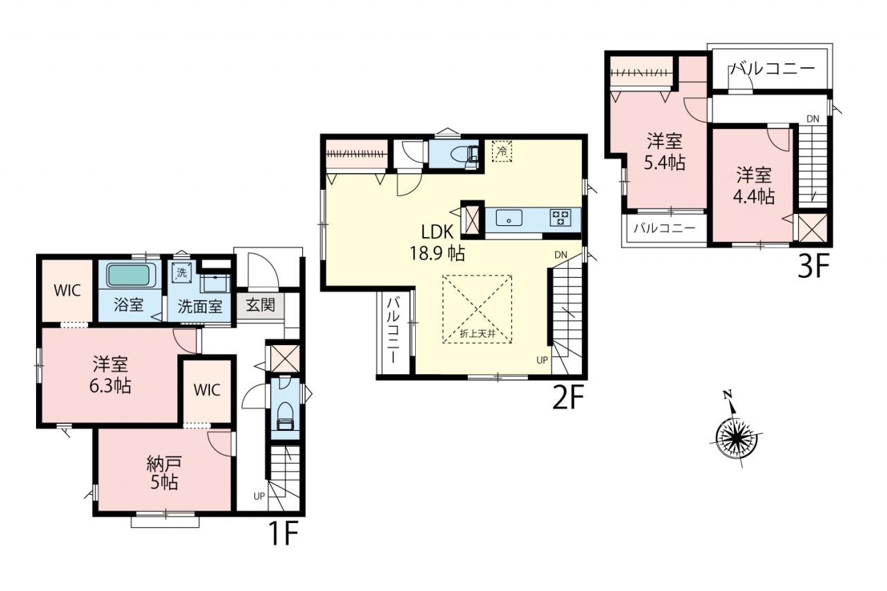 - ※間取りのDEN=書斎(納戸)、SIC=シューズインクローゼット、WIC=ウォークインクローゼット、FCL=ファミリークローゼット、RF=ロフトを表しています。