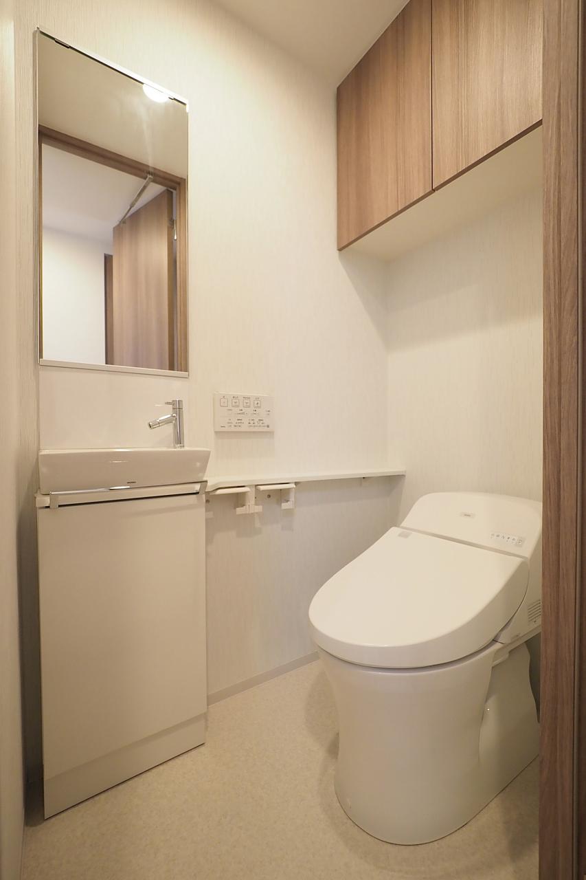 手洗いを設置して機能的でスッキリとした空間のトイレ。