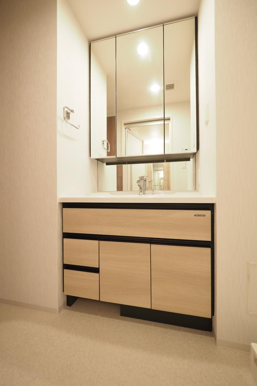 お子様が自分で身だしなみを整えられるチャイルドミラー付きの洗面化粧台。
