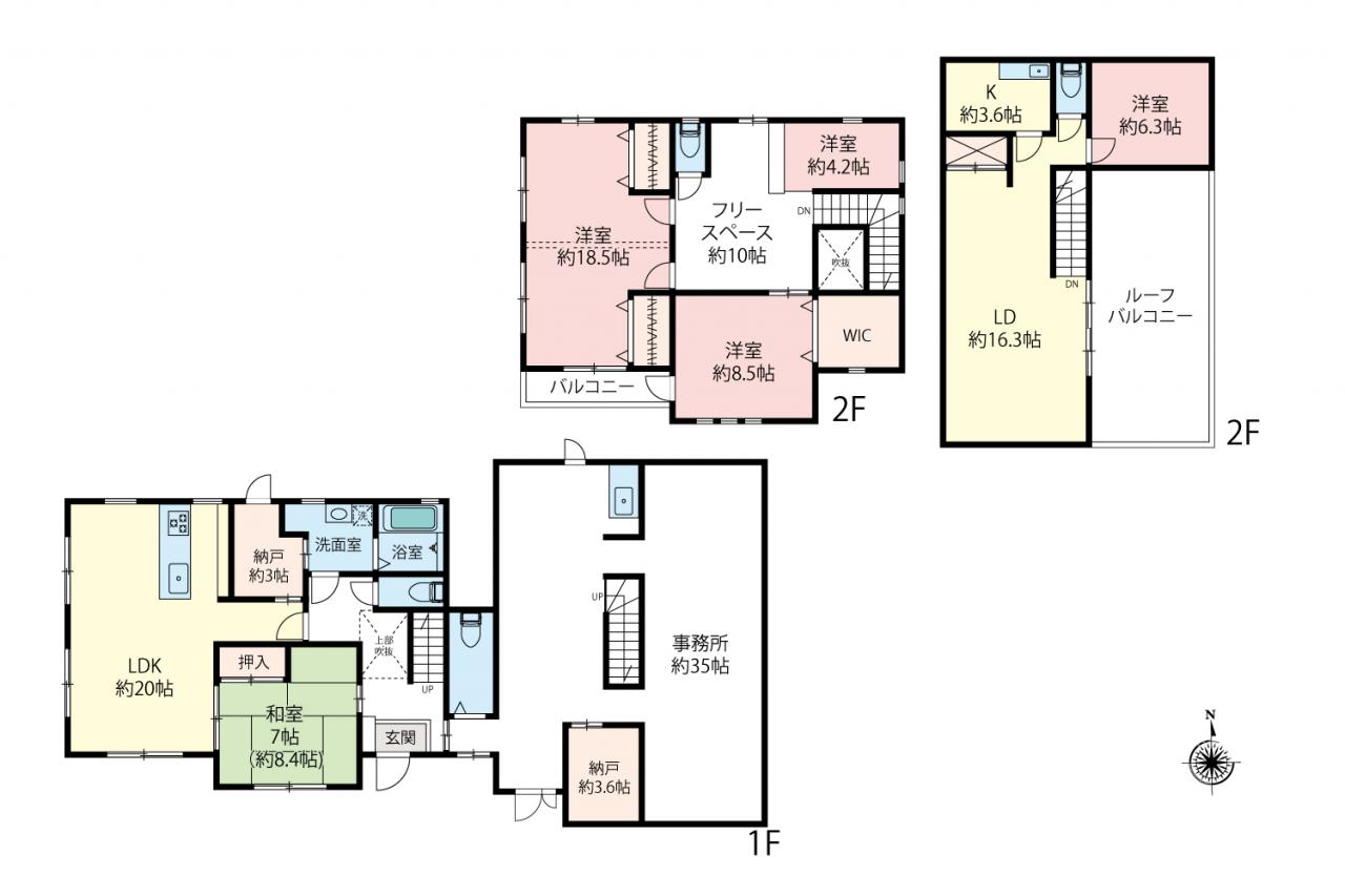 | 備考 | - 敷地の一部に計画道路あり 【部屋詳細】1階:LDK約20帖×1、和室7帖×1、S約3.0帖×1、事務所約35帖×1、S約3.6帖×1 2階:LD約16.3帖×1、K約3.6帖×1、洋室約18.5帖×1、洋室約8.5帖×、洋室約6.3帖×1、洋室約4.2帖×1 カースペースは車種により制限がございます |