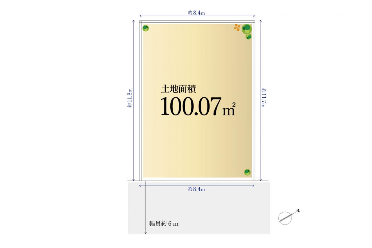 土地面積は100㎡以上、間口8m超とゆとりがあり、前面道路も約6mと開放的。